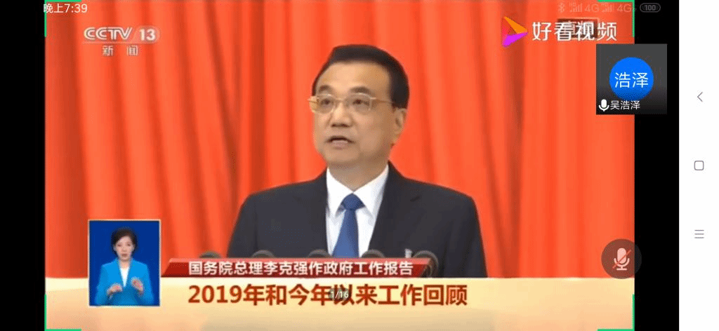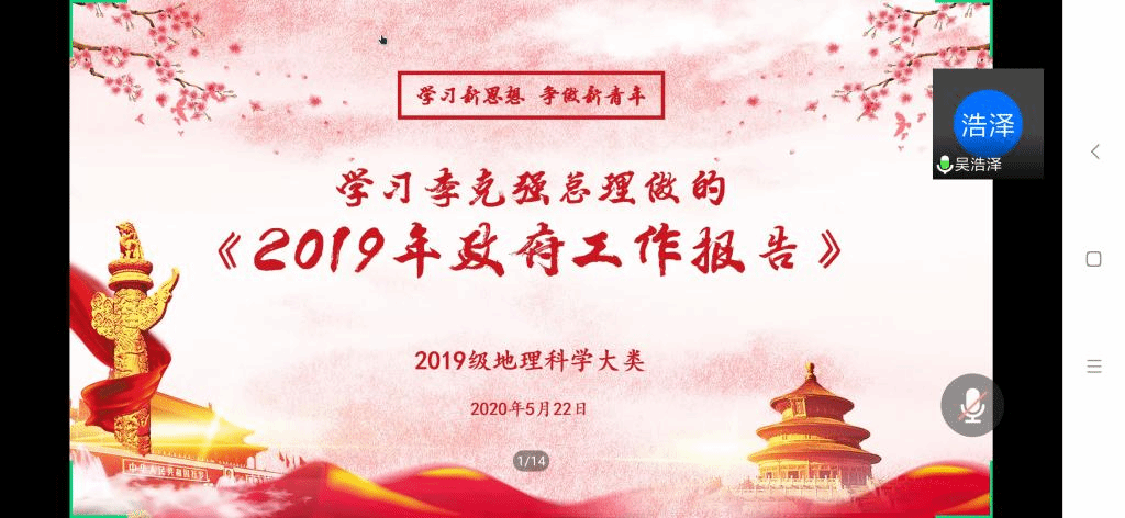 本网讯(地旅学院 武诺 齐小学)5月22日晚上,2019级地理科学大类利用腾讯会议网络平台举行李克强总理政府工作报告的专题学习会议。2019级地理科学(拔尖人才班)、地理科学类1班、2班全体学生干部参加学习会。学习会由2019级地理科学类2班团支书吴浩泽主持。
