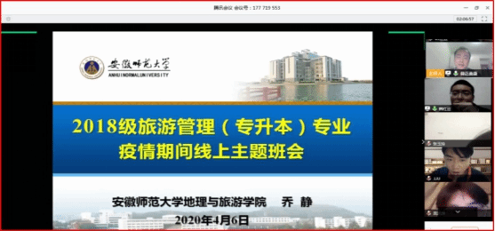 本网讯(地旅学院 田思琦)为响应学校疫情防控期间稳步推进毕业生就业、考研以及安全维稳等相关工作, 2018级旅游管理(专升本)专业于2020年4月8日召开线上主题班会,2018级旅游管理(专升本)专业全体同学参与此次会议,院党委副书记、2018级旅游管理(专升本)兼职辅导员乔静主持并讲话。