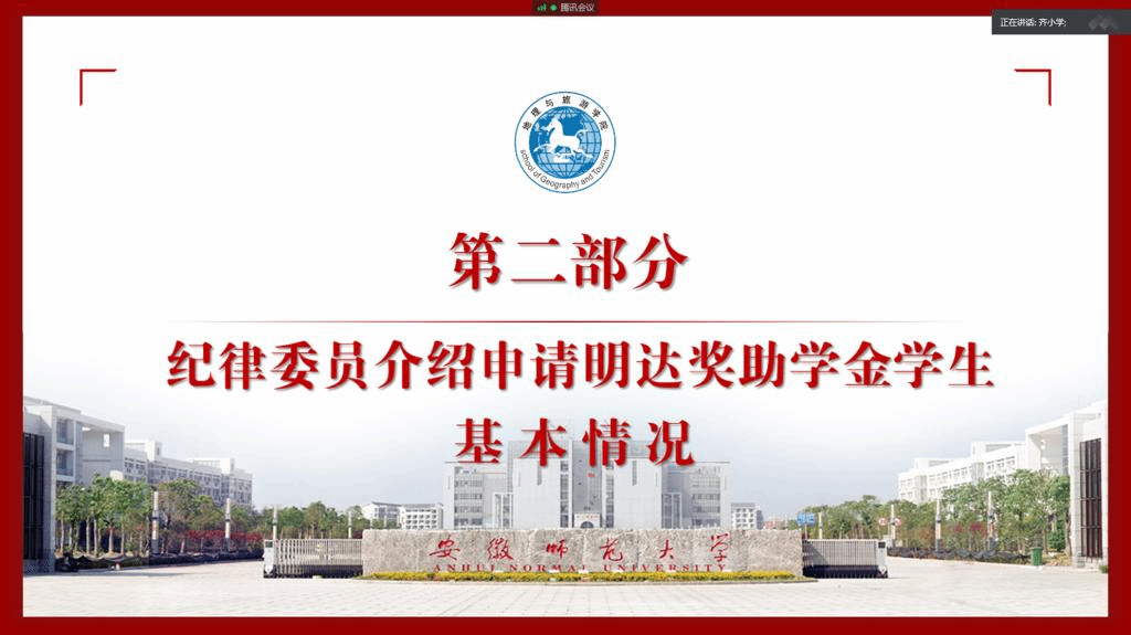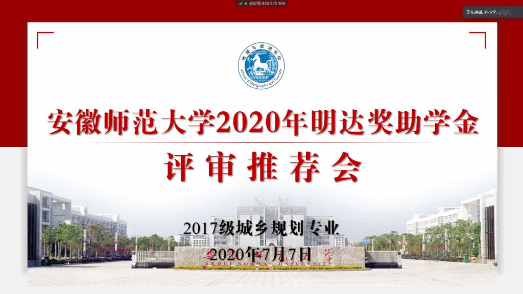 本网讯(地旅学院 齐小学)7月7日下午,2017级城乡规划专业利用腾讯会议网络平台顺利召开明达奖助学金评审推荐会,班级评议小组全体成员参加会议。会议由评议小组组长、辅导员齐小学主持。