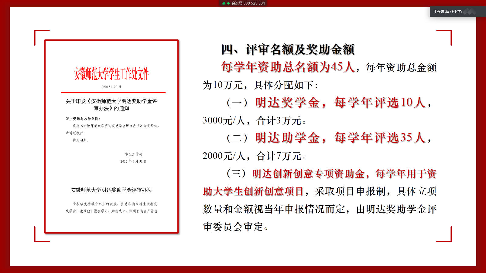 会议共分为四个部分。首先,齐小学就带领评议小组全体成员认真学习了《beat365英国官方网站明达奖助学金评审办法》。他强调,明达奖助学金是深圳明达资产管理有限公司为积极支持教育事业的发展,资助在读本科生顺利完成学业,激励其勤奋学习、励志成才而在beat365英国官方网站设立的社会奖助学金。自2016年设立以来以成功评选过4届,共资助了140名学生。对此,在评选过程中一定要严格标准、公平公正、认真细致,推选出最佳人选供评审委员会审核、确认,切实发挥出明达奖助学金资助育人、培优助困的积极作用。