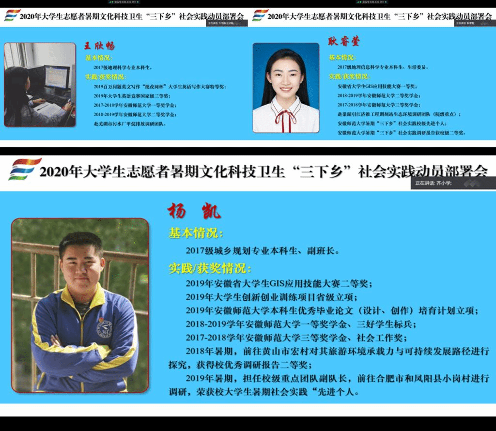 接着,受邀参加会议的王欣畅、耿睿萱、杨凯等三位学长学姐进行了暑期社会实践经验分享。他们结合自己丰富的暑期社会实践经历和专业学习经验,从选题确定、团队组建、立项准备、实践过程和成果总结等方面进行了详细讲解,给予了富有建设性意义的建议,并现场为同学们进行答疑解惑。
