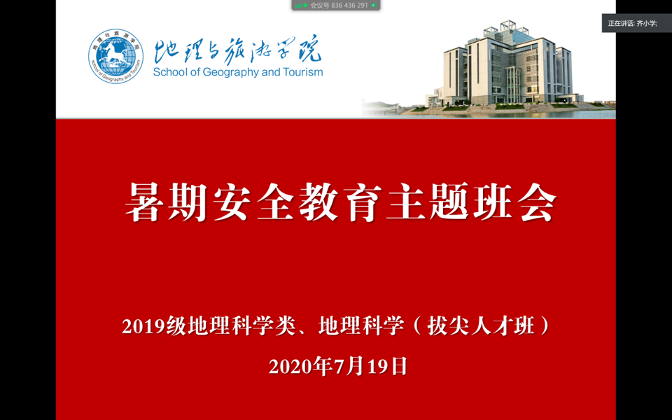 本网讯(地旅学院 武诺 齐小学)在新冠肺炎疫情防控常态化、当前洪涝灾害多发频发的特殊背景下和大学生暑期社会实践全面启动之际,7月19日晚,2019级地理科学大类通过腾讯会议平台召开暑期安全教育主题班会。2019级地理科学类1班、2班和地理科学(拔尖人才班)全体同学参加会议,会议由辅导员齐小学主持。
