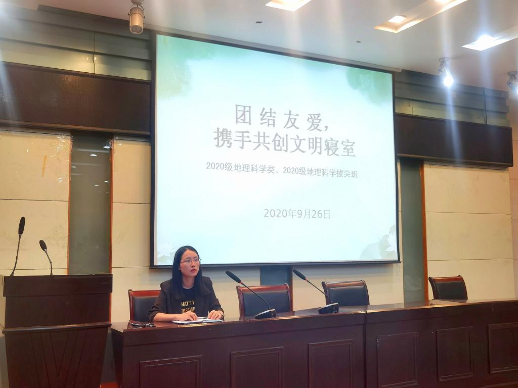 本网讯(邵宇萌 彭媛媛)为营造和谐温馨的寝室氛围,创建文明安全友爱的寝室环境,2020年9月26日晚,beat365英国官方网站2020级地理科学类、地理科学(拔尖班)在实验楼101举行了“团结友爱,携手共创文明寝室”主题班会,会议由辅导员彭媛媛主持。