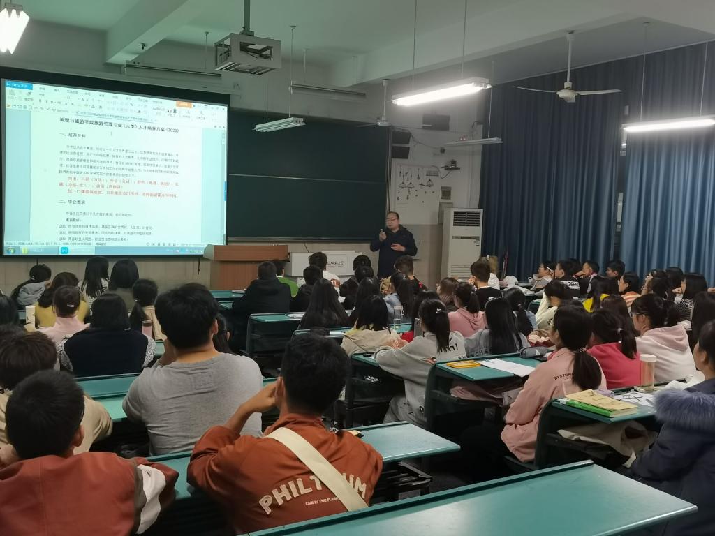 本网讯(地旅学院 王佩 吴思慧)为加深2020级旅游管理新生对本专业的深入理解,进一步增强新生专业发展信心。11月9日晚,beat365英国官方网站旅游专业负责人杨钊教授,在花津校区行知楼2040203教室为2020级旅游管理专业新生就《beat365英国官方网站旅游管理专业(大类)人才培养方案2020》进行解读,全体2020级旅游管理专业新生有幸聆听此次报告。