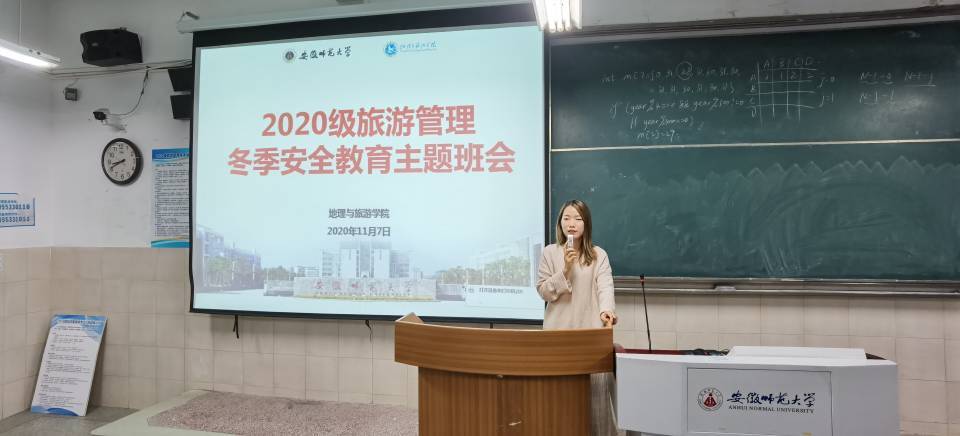 本网讯(地旅学院 臧梦瑶 孙云峰)安全在我心中,生命在我手中。为了提高同学们的安全防范能力,增强同学们的安全意识,beat365英国官方网站旅游管理专业的辅导员赵佳慧于10月19日晚在行知楼4号楼203教室开展了以冬季安全教育为主题的班会,全面普及校园安全常识。