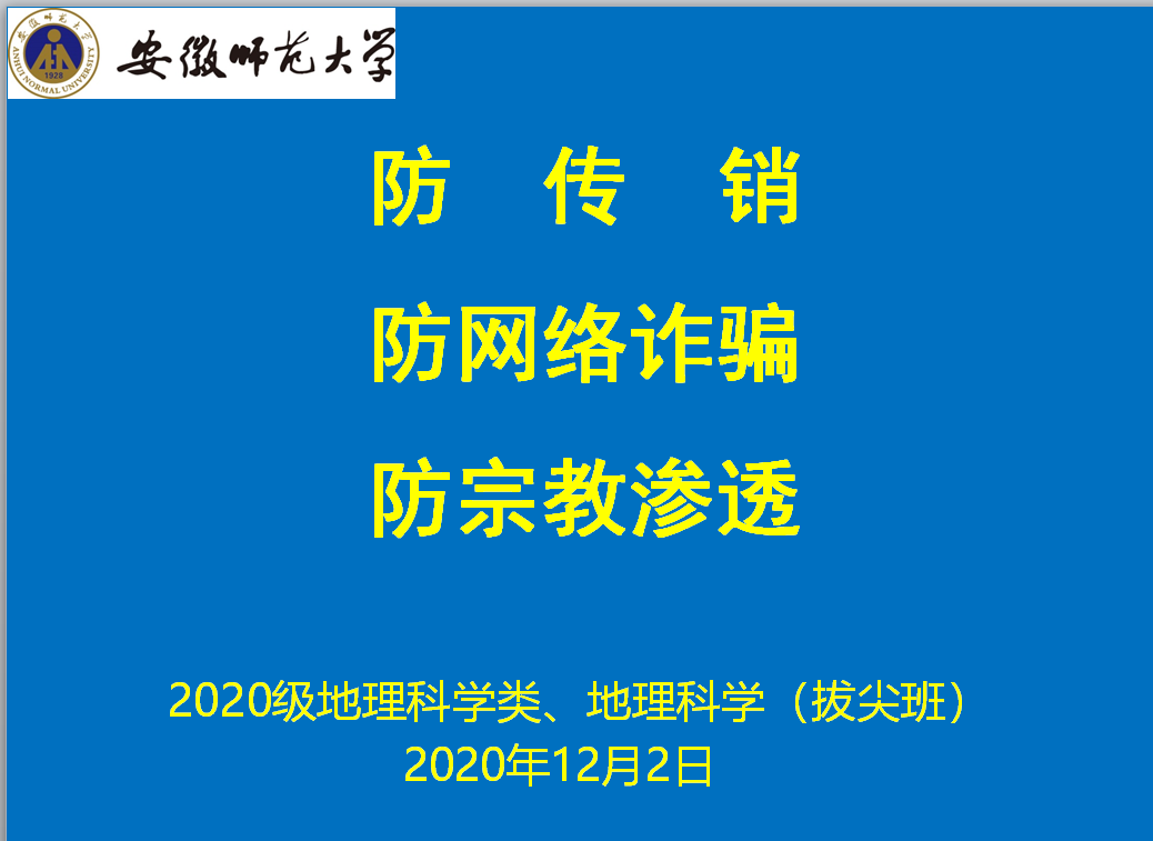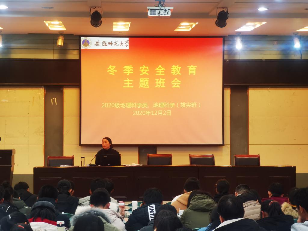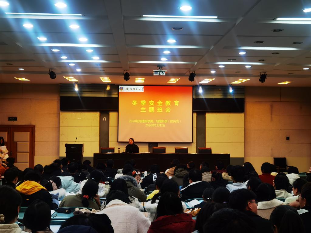 本网讯(刘思圻 彭媛媛)2020年12月2日晚,2020级地理科学类、地理科学(拔尖班)在beat365英国官方网站实验楼101召开了冬季安全教育主题班会,旨在使学生们在冬季火灾这个火灾高发期提高警惕,防微杜渐,防患未然,注意人身安全,严格遵守校规校纪。班会由辅导员彭媛媛主持。