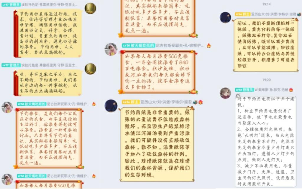 为增强此次学习效果,在生活委员唐英宇的组织下,班级同学于当晚以寝室为单位开展民主生活会,自我反思日常生活中是否有浪费不节约的行为,并励志做到寝室同学相互监督,形成浪费可耻、节约光荣的良好氛围。