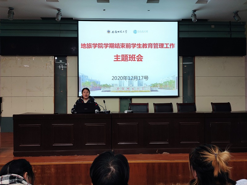 本网讯(地旅学院 孙夏路遥)12月17日下午,地旅学院学期结束前学生教育管理工作主题班会在学院实验楼101报告厅举行。2017级地理科学、旅游管理、土地资源管理及酒店管理专业全体同学参加,辅导员王美主持会议。