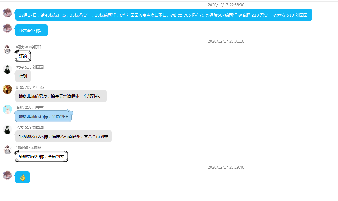 寝室长会议上,张慧指出每位同学都需要一个健康整洁、充满学习氛围的寝室环境,而这离不开寝室长的有效管理。随后,张慧结合近期地旅学院查寝情况,强调了寝室安全和卫生的重要性。她表示,寝室长要做好提醒工作:出门关电源、晨午晚测温、按时健康打卡、及时完成线上晚点名;寝室长还需如实报备寝室成员状况,定期开展卫生打扫和安全排查工作,确保每位同学的安全。后期将会安排生活委员、安全委员等班委进行晚归不归突击查寝,并不定期检查每个寝室的卫生状况。
