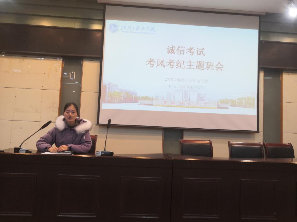 本网讯(地旅学院 丁茹栩 罗文菁)营造考试氛围,强化法纪观念。2020年12月27日晚上七点半,2018级地理科学(师范)专业考风考纪教育主题班会在地旅实验楼101报告厅顺利举行。班会由辅导员丁茹栩主持。