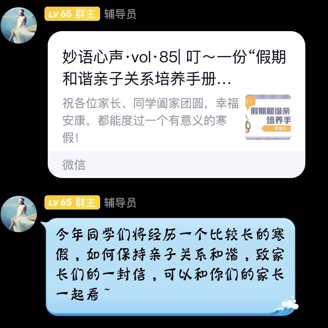 寒假期间,为增进同学们与父母之间的交流与沟通,保持亲子关系和谐。辅导员赵佳慧在班级QQ群中分享了一份“假期和谐亲子关系培养手册”,倡导同学们与家长一起学习,教育同学们对父母要多一份体贴多一份问候。同时,结合本专业开展的“摄生活之旅,影寒假之游”为主题的摄影活动,鼓励同学们发现生活中的美,寻找有特色的人文自然风景,用相机记录下美好瞬间。活动中,同学们通过摄影相互分享你我各自眼中家乡的美景、美食,增加了同学之间的交流与联系。