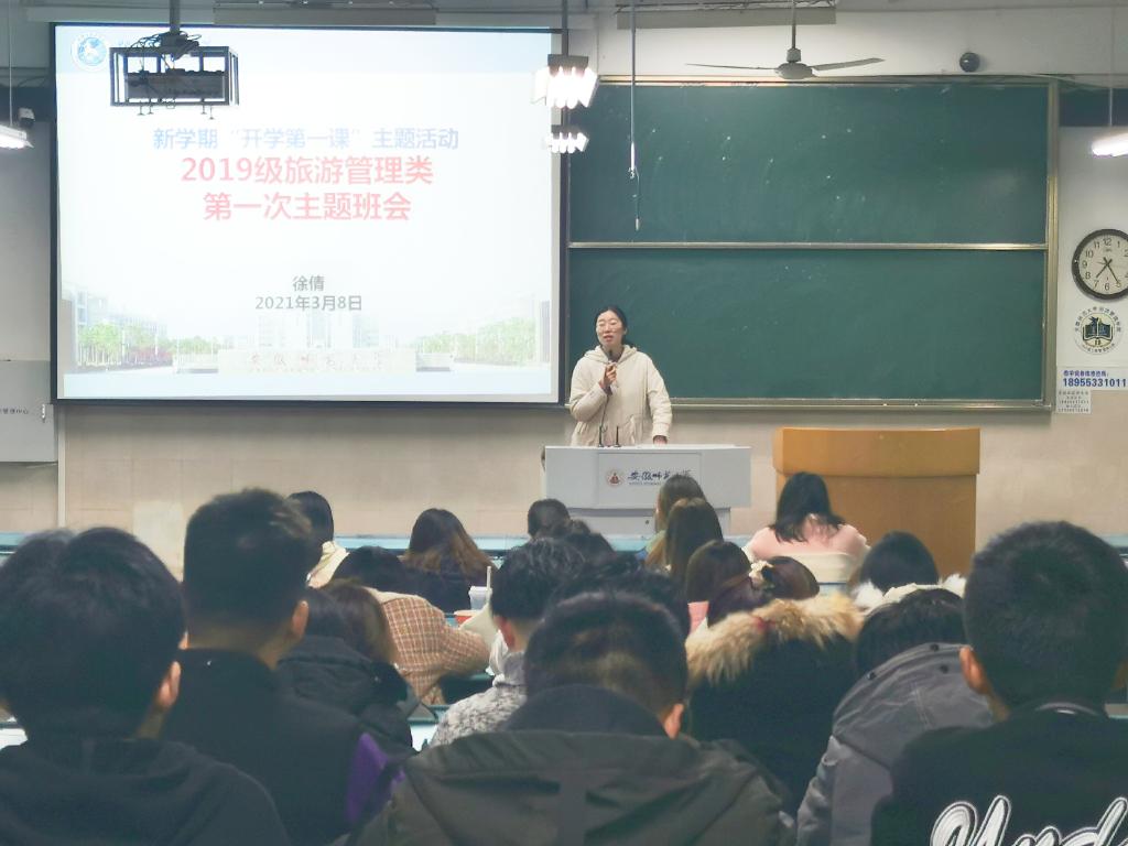 本网讯(19旅管 凡语馨 徐倩)阳春三月归校园,开学一课助成长。为了庆祝中国共产党成立100周年,积极响应学校的号召,进一步加强大学生思想政治教育,激发广大同学以饱满的精神、奋进的姿态投入新学期的学习和生活。2021年3月10日至12日期间,beat365英国官方网站2019级旅游管理大类专业组织开展了一堂思政课、劳动课、安全课、法制课、疫情防控课——“开学第一课”系列活动,辅导员徐倩老师及全体19级旅游管理大类同学参与活动。