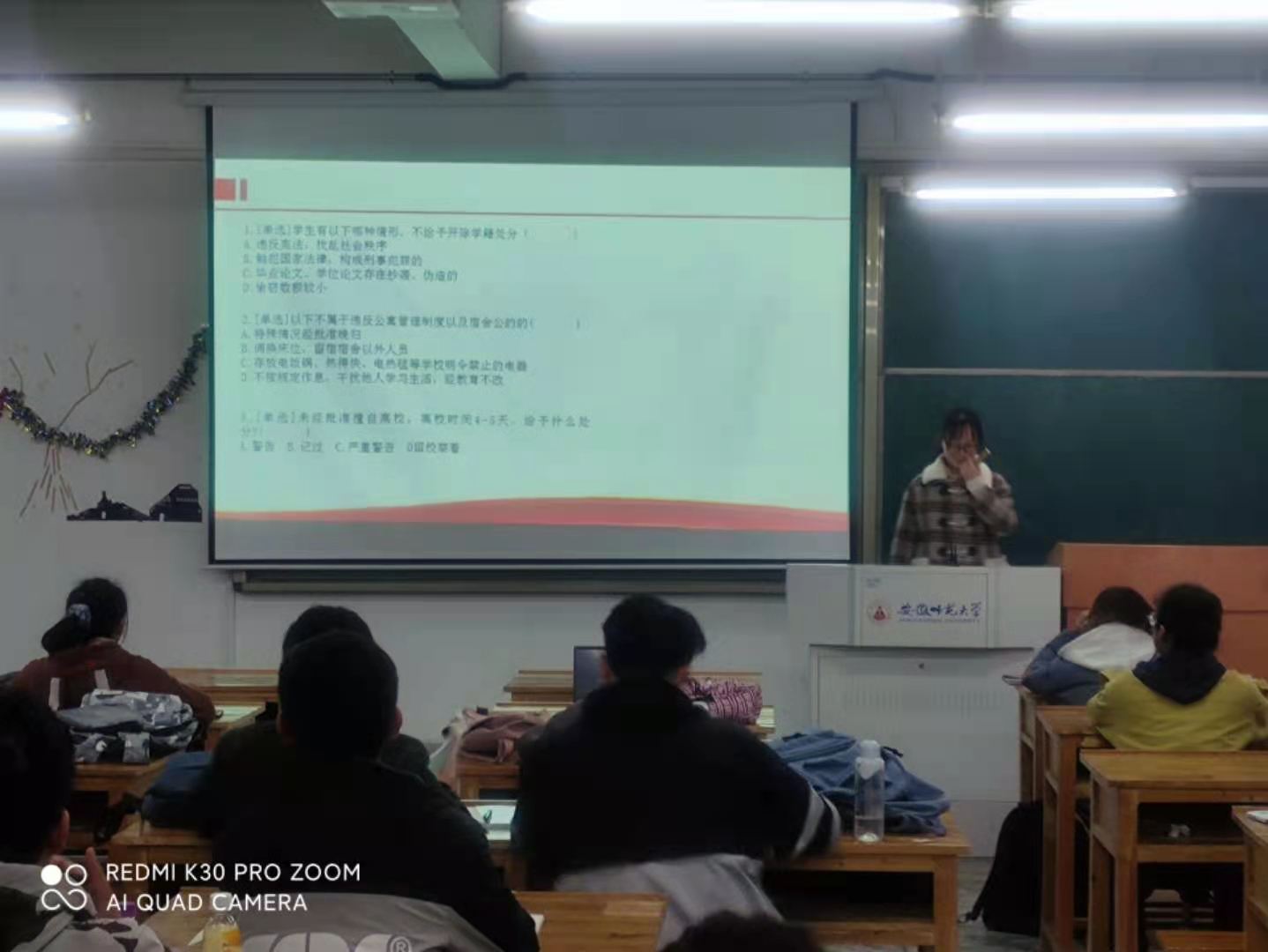 首先,徐嘉祺以提问的方式引出活动主题,通过精彩的案例以及学校对违纪同学的通报决定向各位同学强调了认真学习并严格遵守校规校纪的重要性。接着,徐嘉祺带领大家认真学习校规校级,并领读beat365英国官方网站学生管理“四项禁令”:严禁擅自离校、严禁私自租房、严禁晚归不归、严禁违规电器,通过竞答的方式对班级同学进行校规校级知识考核。最后,辅导员刘少杰通过讲述真实案例向大家再次强调认真学习并严格遵守国家法律法规和校规校级的必要性和重要性,并对每位同学提出要求:对于校规校级的学习不仅要内化于心,也要外化于行!