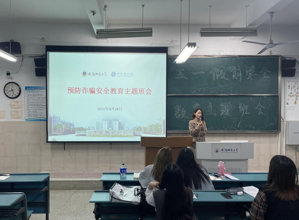 本网讯(地旅学院 赵佳慧 孙云峰)安全校园,预防在先。为进一步加强学生的安全教育管理,提高学生的防诈骗意识,同时营造平安和谐稳定的校园环境,4月28日,20级旅游管理专业辅导员赵佳慧在行知楼4号楼203教室召开了以“防诈骗”为主题的安全教育班会,20级旅游管理的全体同学参与此次班会。