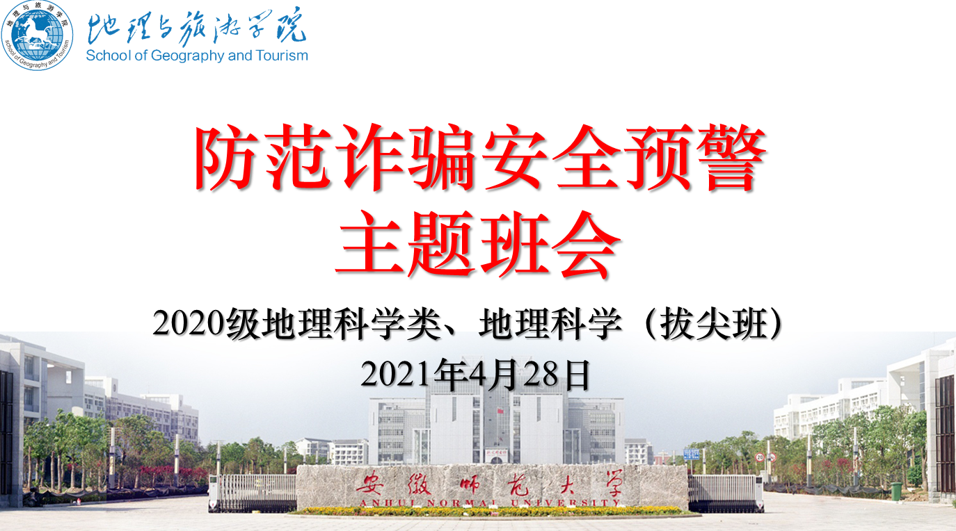 本网讯 (廖琴 黄睿卿 彭媛媛)为提高同学们安全意识,增强防骗能力,4月28日,2020级地理科学类、地理科学(拔尖班)在腾讯会议平台召开防范诈骗安全预警线上主题班会,会议由辅导员彭媛媛老师主持,2020级地理科学类、地理科学(拔尖班)全体同学参加。
