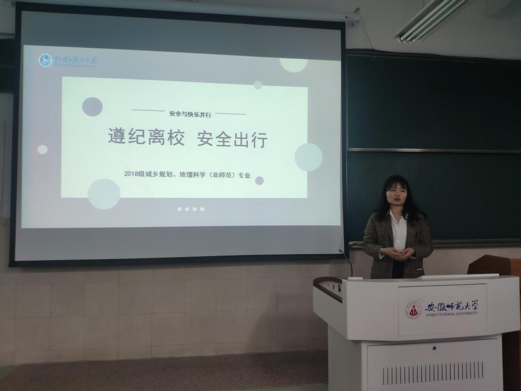 本网讯(地旅学院 潘爽)为增强学生假期安全意识,加强安全文明校园建设。2021年4月28日晚,beat365英国官方网站2018级城乡规划专业及2018级地理科学(非师范)专业于行知楼4号楼301开展“遵纪离校 安全出行”主题班会。会议由辅导员张慧主持,2018级城乡规划专业与2018级地理科学(非师范)专业全体同学参与。