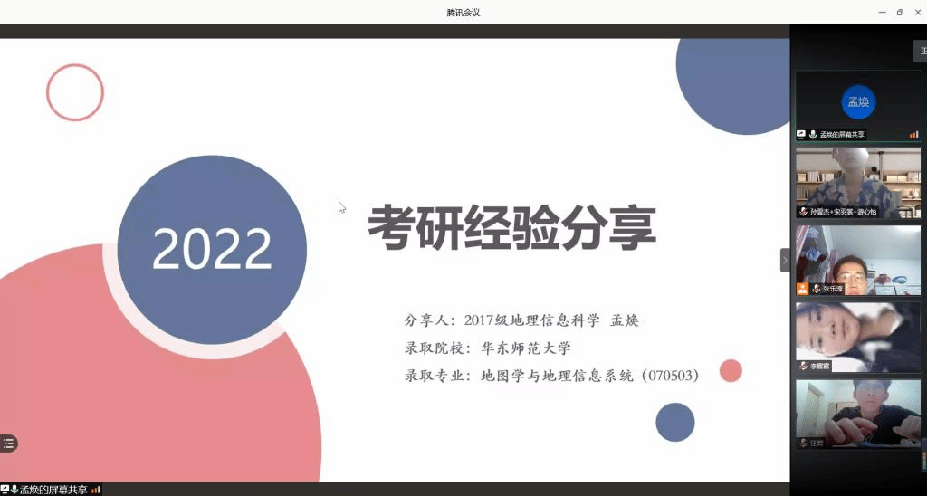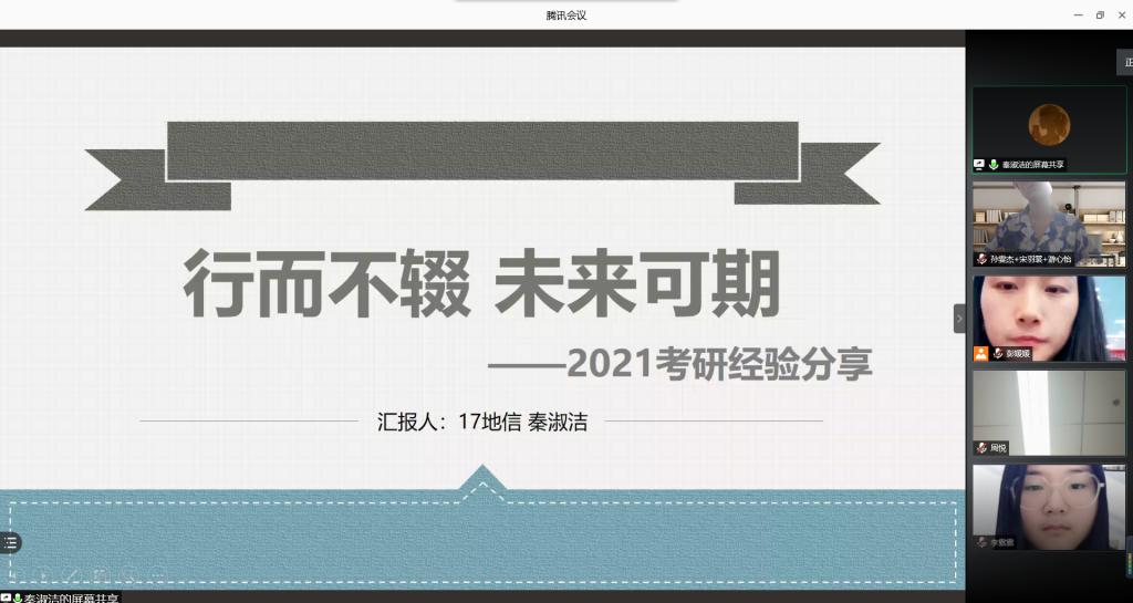 本网讯(孙雯杰 彭媛媛)为引领同学们找准自身定位,明确未来方向,传授考研经验,2018级地理信息科学专业在2021年5月19日晚上8:00于腾讯会议召开考研经验交流会,专业负责人汪左老师,2017级考研学生代表、2018级地理信息科学专业全体同学参与,会议由辅导员彭媛媛主持。