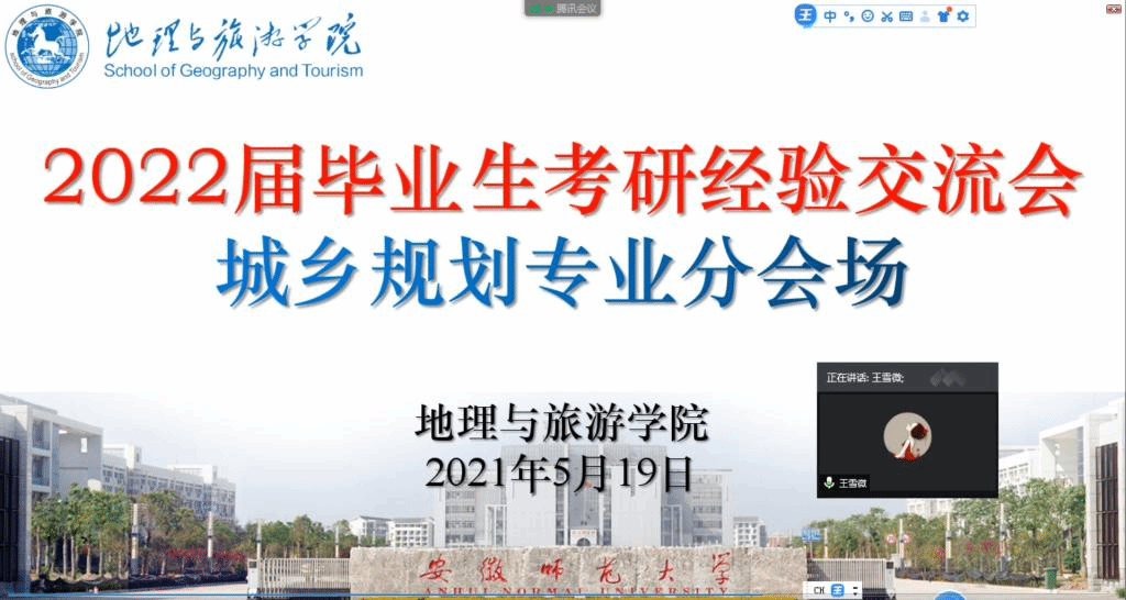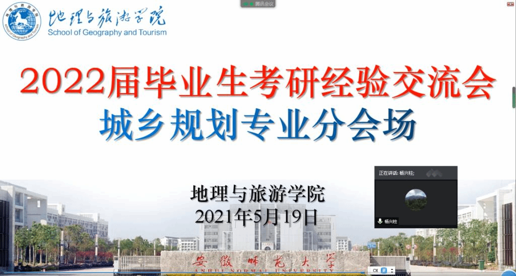 本网讯(张慧 刘圆圆)为解决学生考研存疑问题,引领学生合理选择目标院校,5月19日晚八点,地旅学院于线上开展了城乡规划专业考研经验交流分享会。专业负责人杨兴柱教授、专业副主任王雪微老师、2017级考研学生代表、2018级城乡规划专业全体同学参与会议,会议由辅导员张慧主持。