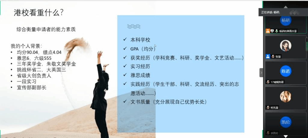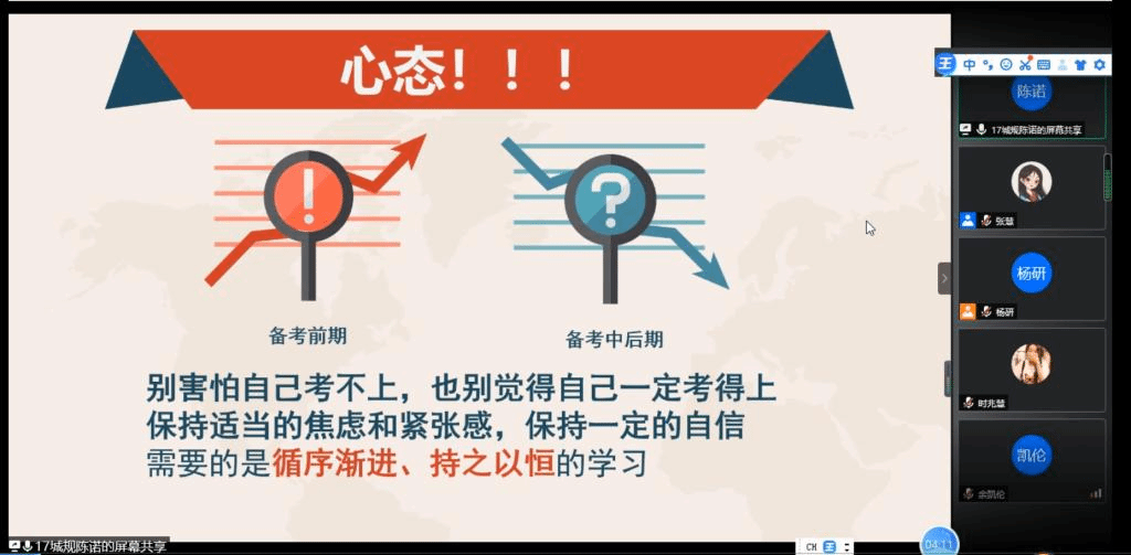 会议共有三部分组成,2017级学生代表进行考研经验分享、专业老师进行考研志愿填报及备考指导和线上互动交流提问。