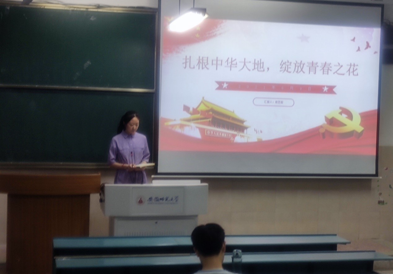 本网讯(地旅学院 刘少杰 耿艺榕)为全面贯彻落实习近平总书记在党史学习教育动员大会上的重要讲话精神,积极响应“学史明理、学史增信、学史崇德、学史力行”的号召,提高同学们的思想修养,推动“学党史、强信念、跟党走”学习教育持续深化。6月9日晚七点半,2020级城乡规划班“青春心向党 党史我来讲”党史宣讲主题活动第五讲开讲。本次主讲人为班级宣传委员、入党积极分子耿艺榕,主题为《扎根中华大地,绽放青春之花》。