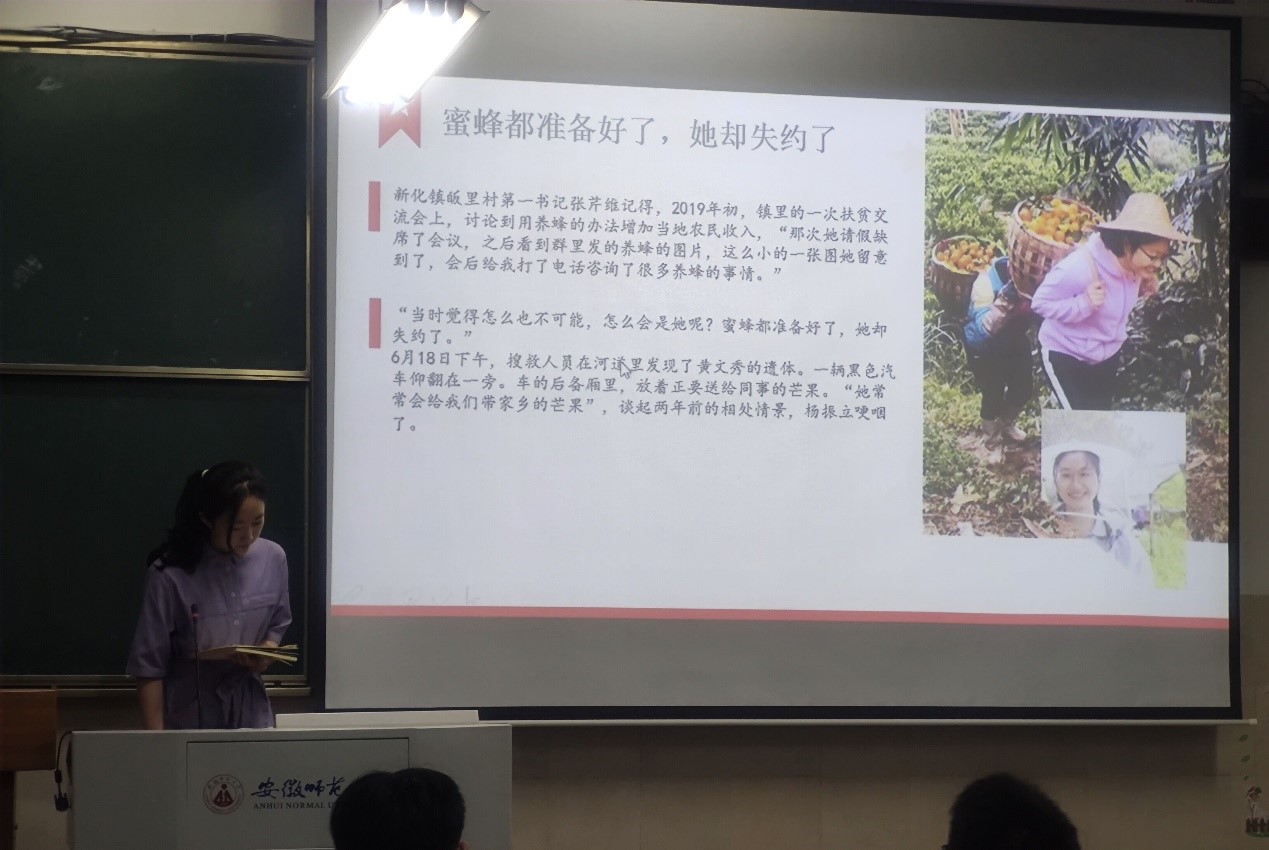 耿艺榕首先介绍了党的群众路线的基本内涵及在党的思想中的重要地位。从抗战时期选取中共领导人牵头的陕甘宁边区的群众性大生产运动和淮海战役人民对解放军队的支持,展现了战争时期党的群众路线的生动实践。从当代出发,耿艺榕以数字展示我国对脱贫事业的重视和做出的艰苦卓绝的努力;通过播放视频,为大家展现我国在脱贫攻坚战场上的出色成就,并播放《感动中国》片段介绍了脱贫干部典型黄文秀通知的感人事迹。国家脱贫事业的发展让我们看到党对人民生活的关心及重视,让我们看到一批批青年干部为祖国事业燃烧着自己的青春,点亮了一方光明。接着,耿艺榕提到1998年的抗洪抢险,从中央到地方,举国上下、各层各级对受灾群众和抢险军民的关心,是当的群众路线的又一生动事例。