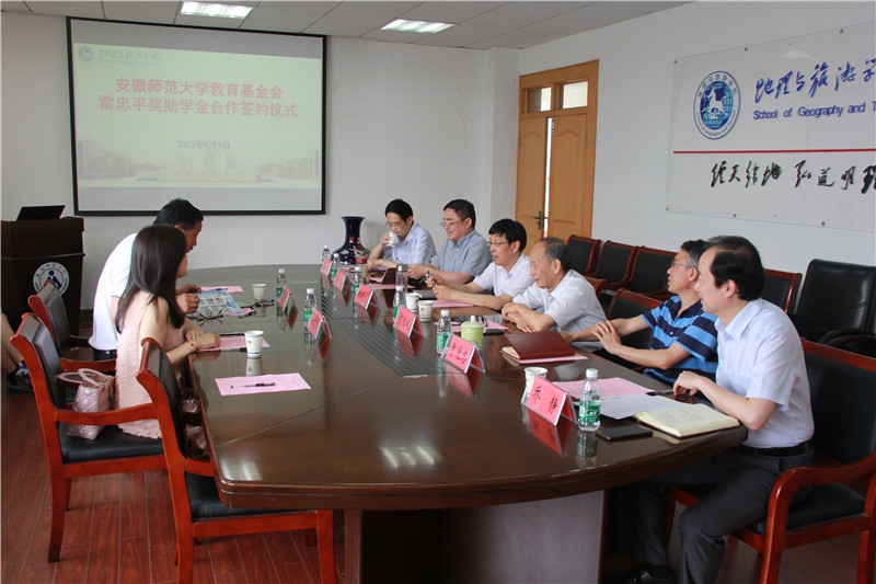本网讯(地旅学院 汪琦 徐林威 彭媛媛)捐资助学,情系母校。6月9日下午,beat365英国官方网站教育基金会雷忠平奖助学金合作签约仪式在地旅学院行政楼四楼会议室举行。安徽科蓝特铝业有限公司董事长雷忠平、广德县星汉房地产开发有限公司副总经理张美玲、校教育基金会秘书长贡植斌、学生处处长刘晓宇、地旅学院党政领导班子及有关人员出席签约仪式。仪式由地旅学院党委副书记乔静主持。