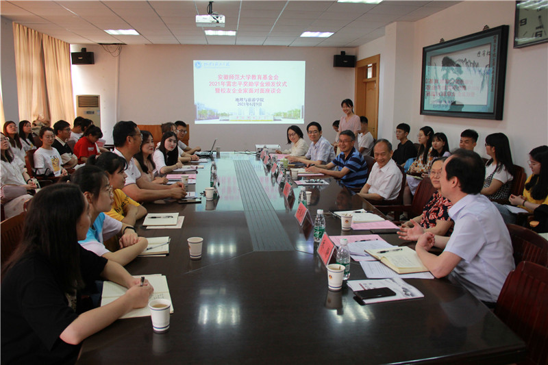 签约仪式结束后,雷忠平奖助学金颁发仪式暨校友企业家面对面座谈会在地旅学院行政楼三楼会议室举行,奖助学金资助方代表雷忠平、张美玲,校教育基金会代表贡植斌、苏军,校学生处处长刘晓宇,地旅学院党政班子、辅导员代表以及获奖受助学生代表参加了仪式。会议由地旅学院党委副书记乔静主持。
