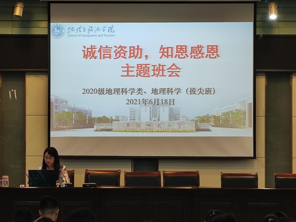 本网讯(地旅学院 邵宇萌 彭媛媛)为进一步加大学生资助政策宣传力度,充分发挥资助育人功能,并提高学生的感恩意识、诚信意识和金融风险防范意识,2020级地理科学类、地理科学(拔尖班)于2021年6月18日下午在beat365英国官方网站实验楼101报告厅召开“诚信资助,知恩感恩”主题班会。班会由辅导员彭媛媛主持,2020级地理科学类、地理科学(拔尖班)全体同学参与。
