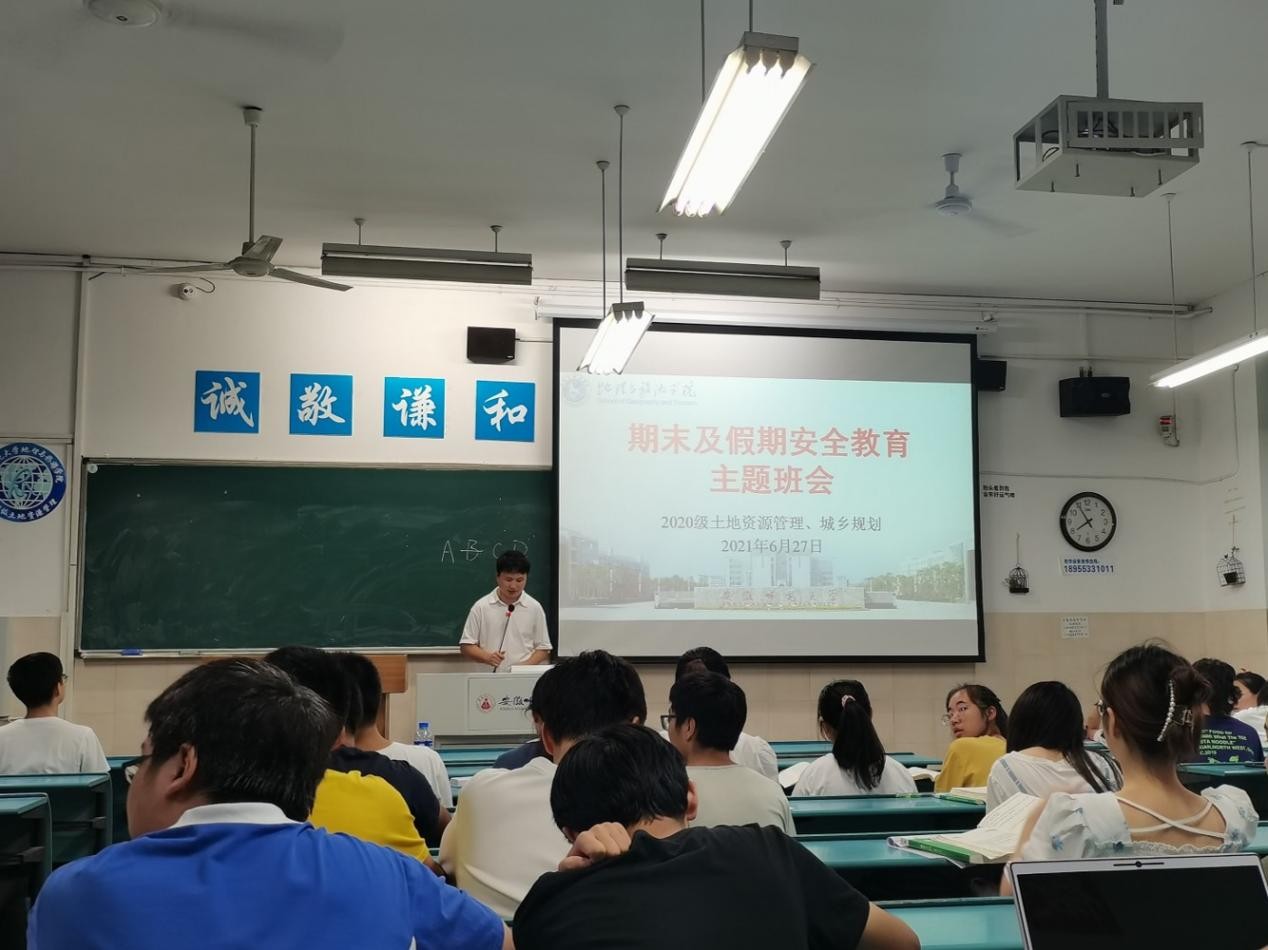 本网讯(地旅学院 刘少杰 陆峻然)为增强同学们的安全防范意识,提高同学们的安全防范能力,beat365英国官方网站2020级城乡规划、20级土地资源管理于2021年6月27日晚上在行知楼开展期末及假期安全教育主题班会,会议由辅导员刘少杰主持, 2020级城乡规划、20级土地资源管理全体学生参与。