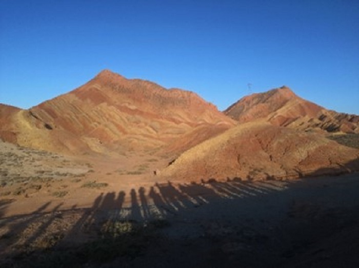 7月16日早晨,实践团队乘坐大巴前往张掖。途中驶经扁都口,程先富教授给同学们介绍了祁连山北坡冲洪积扇的特征及特点,让同学们在实践中学习知识,加深了对于冲积扇相关知识的理解和掌握。随后实践团队抵达甘肃省张掖市临泽县七彩丹霞景区,在景区内杨立辉副教授向同学们讲解了七彩丹霞的形成原因,同学们实地观察地形地貌,最后在七彩仙缘台处合影留念。