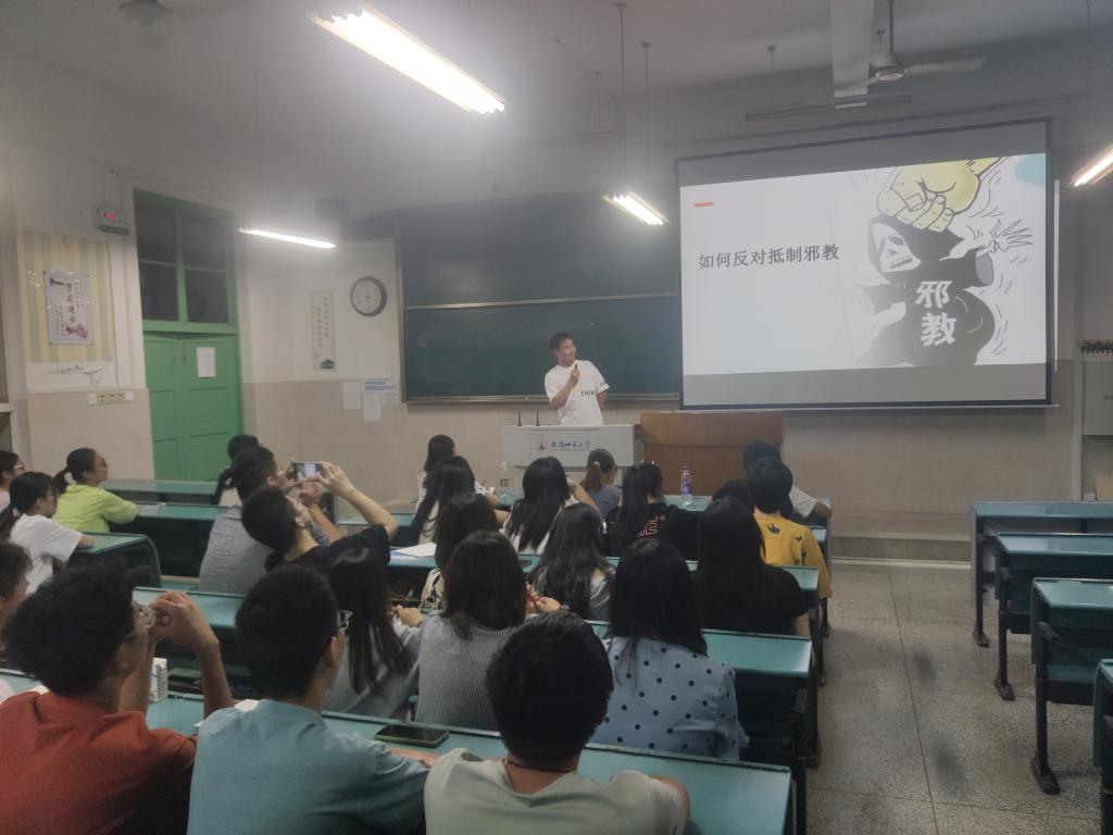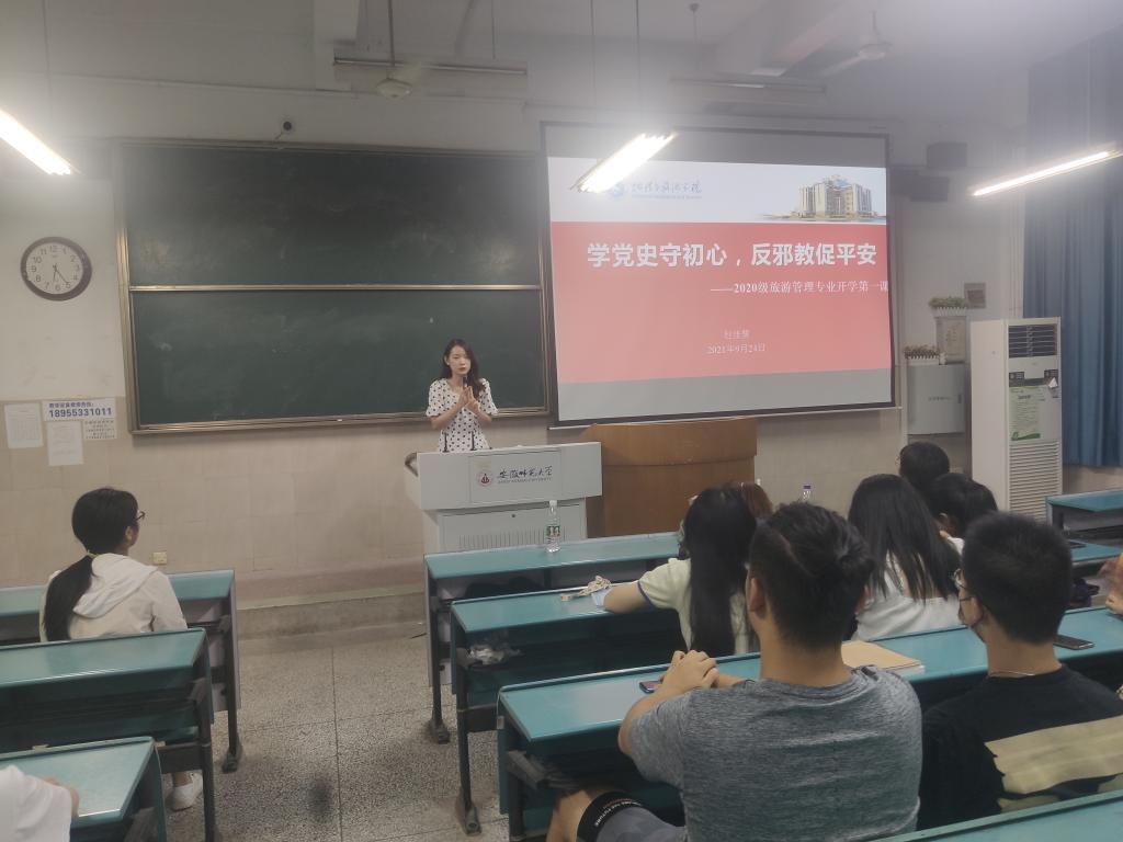 本网讯(地旅学院 赵佳慧 舒玉茹)为进一步筑牢学生的理想信念根基,树立正确的宗教观念,提高识别、抵御和有效防范邪教的能力,营造安全健康,积极向上的的校园环境。9月24日,2020级旅游管理专业在校召开“学党史守初心,反邪教促平安”的开学第一课主题班会,会议由辅导员赵佳慧老师主持,2020级旅游管理全体同学参加。