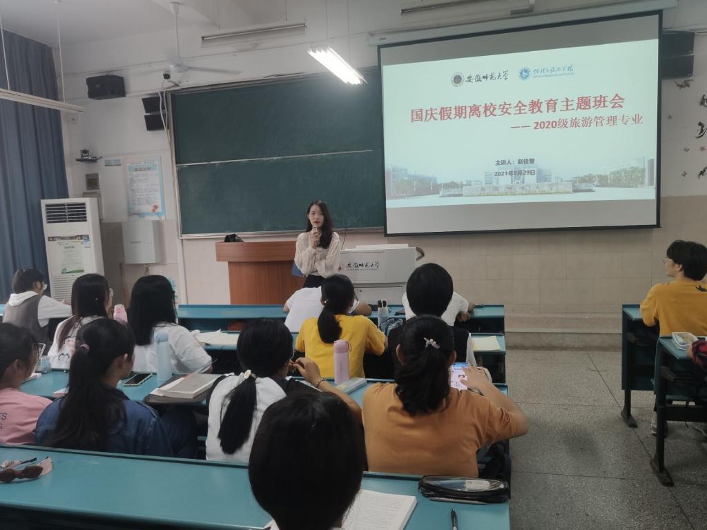本网讯(地旅学院 赵佳慧 舒玉茹)十一假期即将到来,为强化疫情防控主题,响应学校防疫政策,维护校园安全稳定,进一步增强学生的安全意识和防护意识,9月29日,2020级旅游管理专业召开国庆假期离校安全教育主题班会。班会由辅导员赵佳慧老师主持,2020级旅游管理专业全体同学参加。