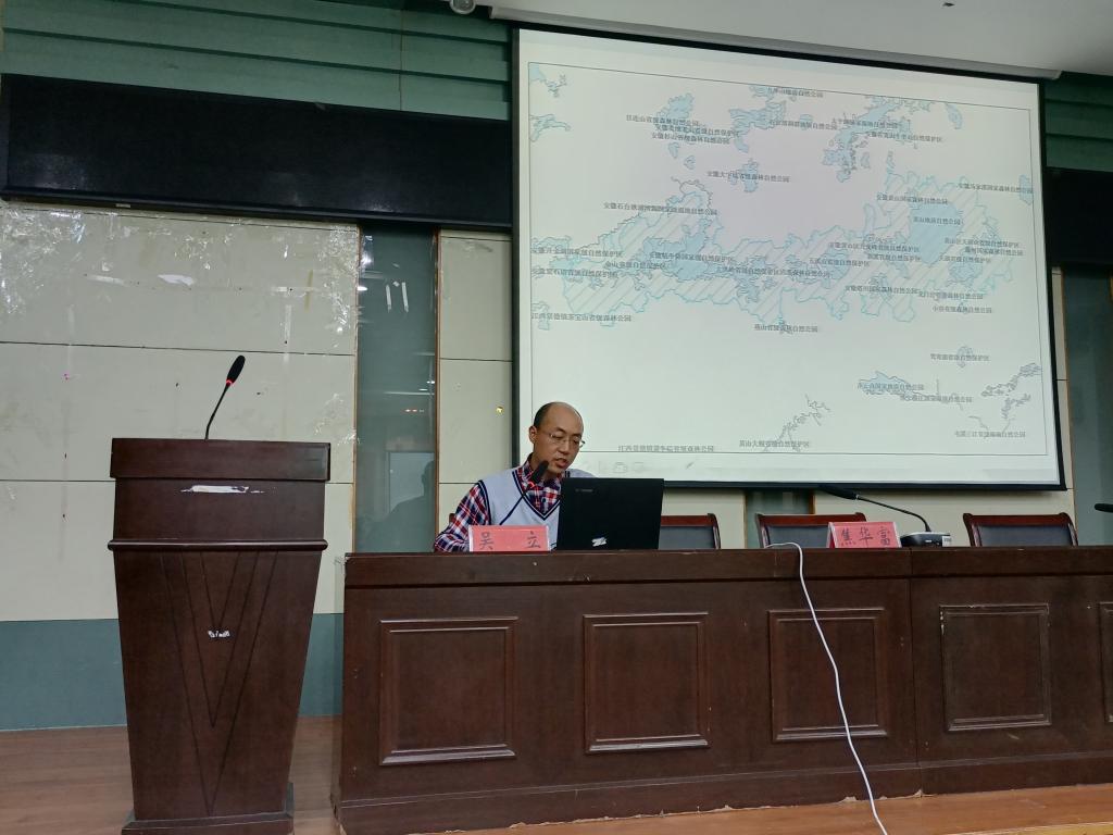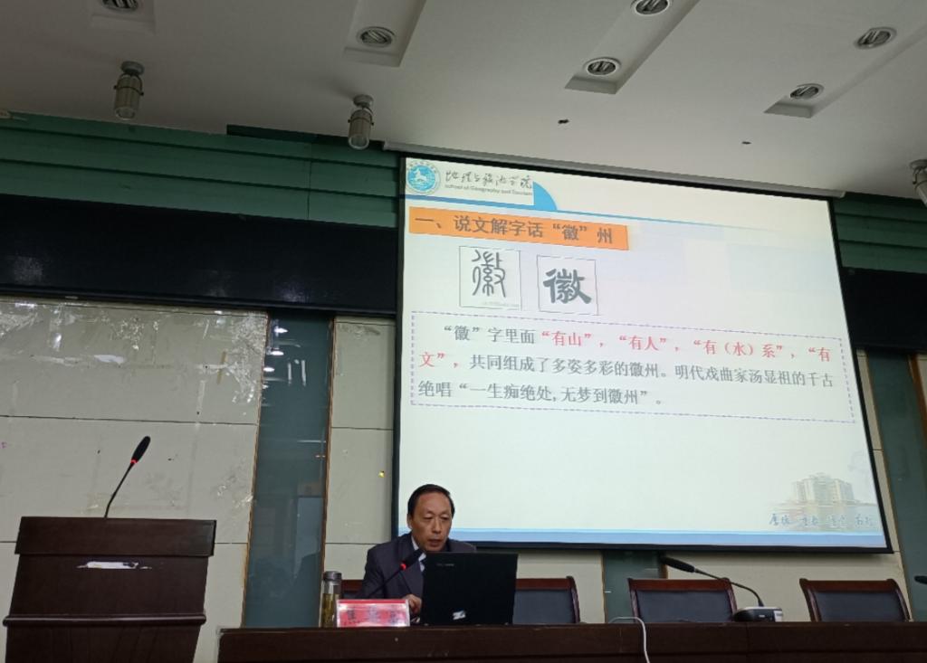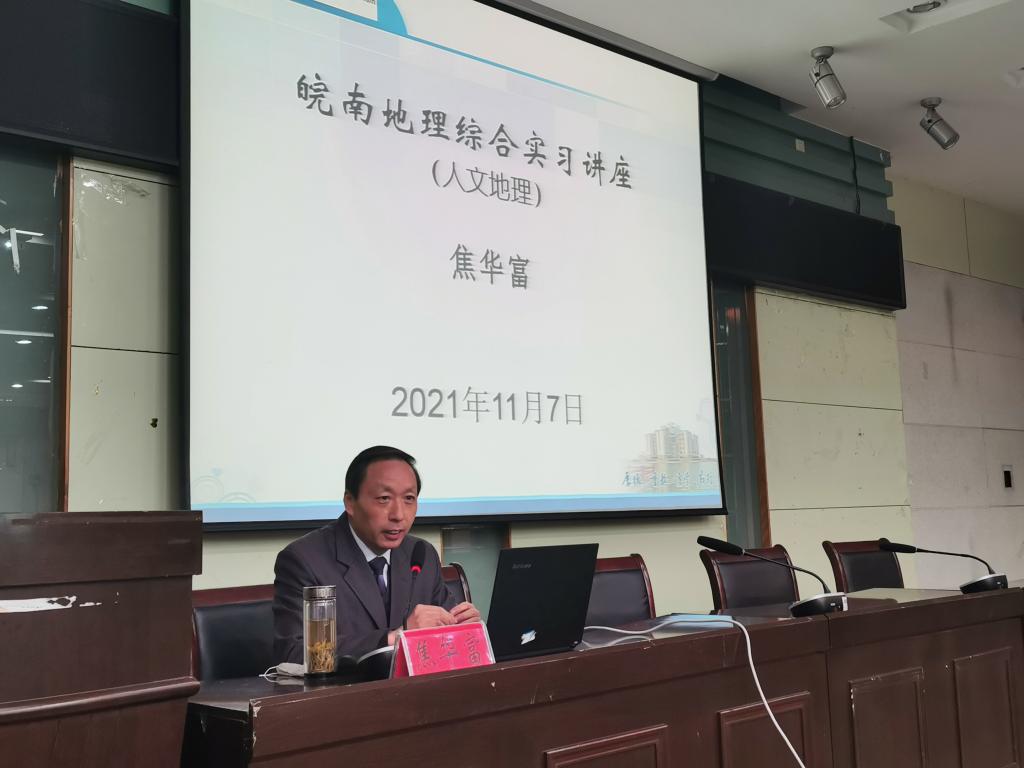 实习讲座上,吴立从自然地理角度出发,详细介绍了实习内容、行程安排以及黄山地区的地质、地貌、水文、气候、土壤、生物等自然地理特征,特别强调了爬山时的安全注意事项,着重说明了此次实习成绩的构成;焦华富则以人文地理为切入点,向同学们介绍了徽州地理特征、古村落选址、人居环境特色、历史文化构成及旅游发展等内容。同学们认真听讲,现场气氛活跃。