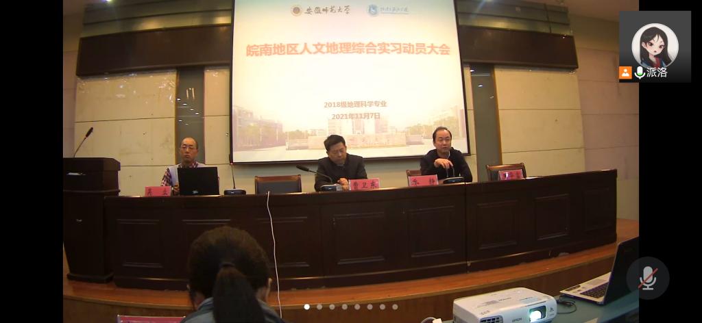 本网讯(地旅学院 文/张慧 李娜 图/丁茹栩 尹仟仟)11月7日晚,地旅学院在学院实验楼101报告厅举行皖南地区人文地理综合实习动员大会暨皖南实习专业讲座“线上+线下”会议。地旅学院副院长曹卫东,党委副书记乔静,实习指导教授焦华富、吴立、赵春雨、方叶兵及辅导员丁茹栩、张慧出席会议。会议严格遵守疫情防控规定,采取“线上+线下”的形式,2018级地理科学专业班委、寝室长参与线下会议,其余学生参与线上腾讯会议。会议由带队老师吴立主持。