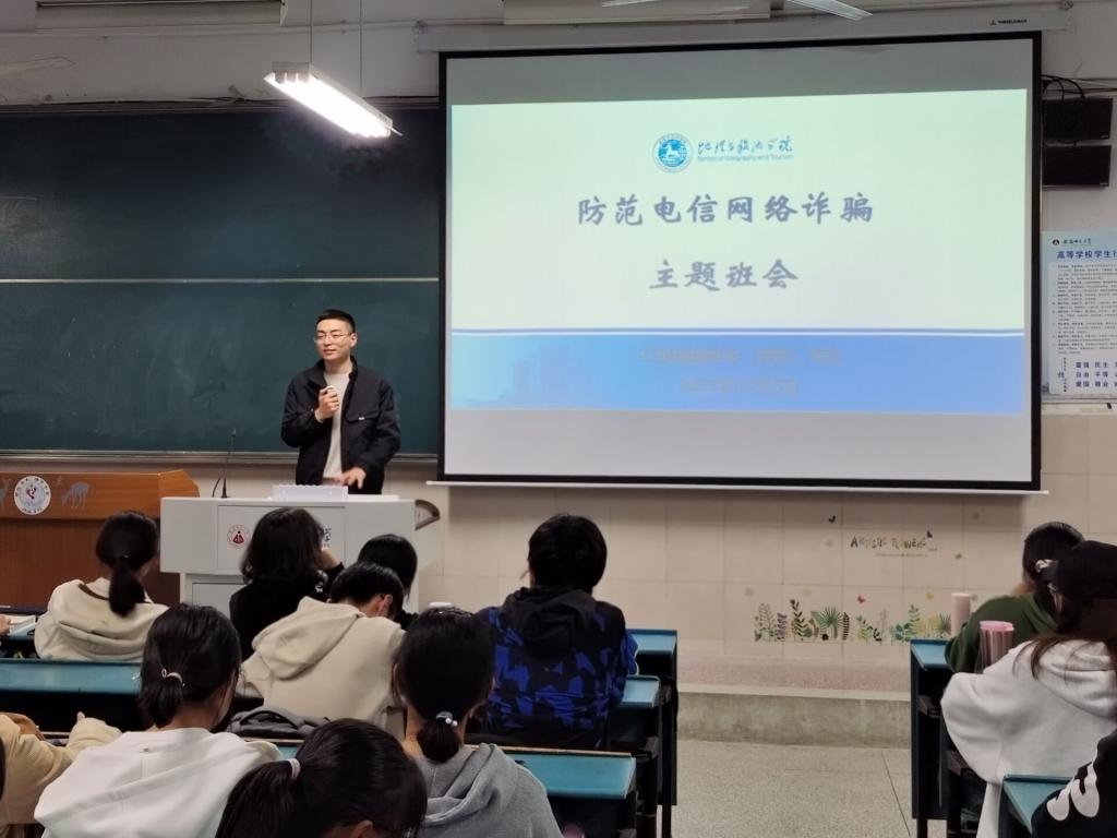 本网讯(韩红豆 翁丹煜 王欣怡)为积极响应学校关于开展防范电信网络诈骗工作要求,进一步普及安全知识,增强学生防范意识,11月5日晚,21级地理科学(师范)在2040202教室召开“防范电信网络诈骗”主题班会,19级旅游管理、酒店管理专业学生通过腾讯会议在线参加,此次班会由辅导员韩红豆主持。