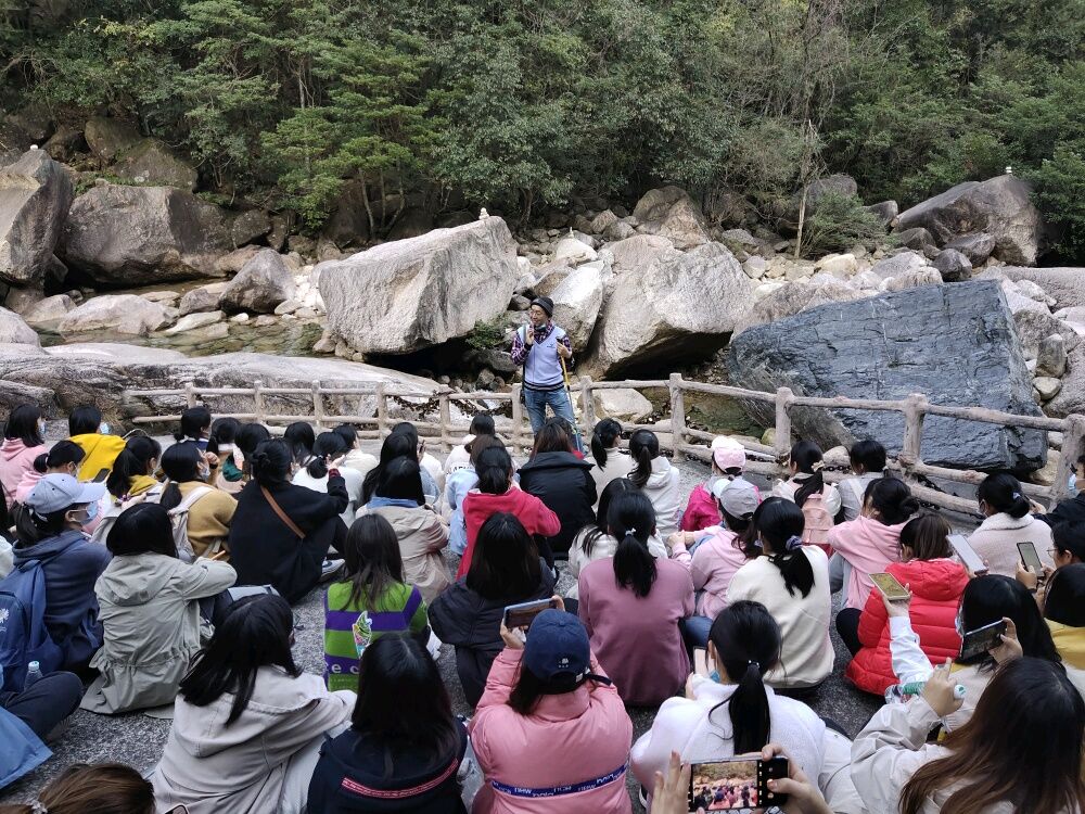 除理论学习与参观学习外,18级地理科学的同学还考察了有“黄山第一丽水”之称的翡翠谷,流连彩池群之间,探求地质成因以及景区开发、设计规划。在考察途中,专业老师吴立老师适时开讲,给学生开展了一堂堂生动的野外地理课,其讲解从地貌的形成,到岩石岩性,再到具体的冰川地貌,不断启发学生思考黄山地质构造等问题。