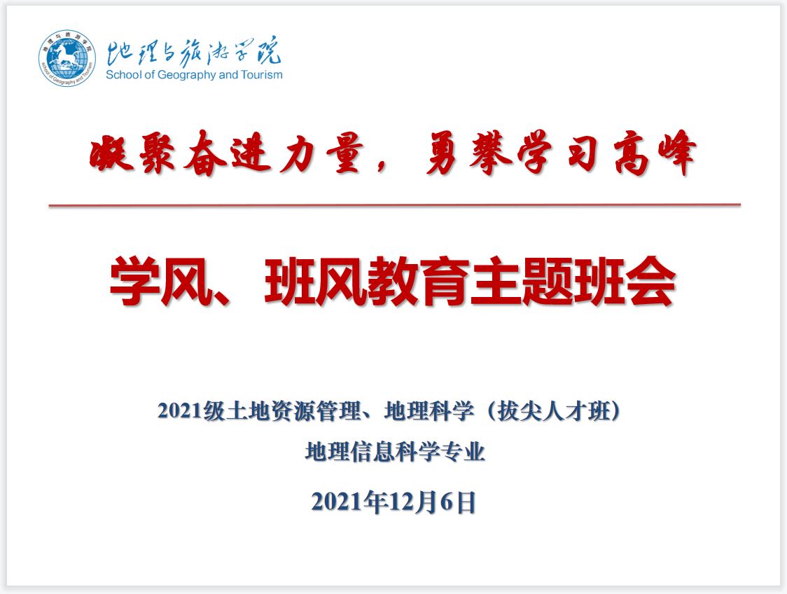 本网讯(地旅学院 马思甜)凝聚奋进力量,勇攀学习高峰。“班风”是一个班级体良好风貌的集中展现,“学风”是提高班级综合素质的关键。为了使新生更好更快地融入集体,构建良好的班集体,12月6日晚辅导员吴文涵带领2021级土地资源管理、2021级地理信息科学及2021级地理科学拔尖人才班开展了以“凝聚奋进力量,勇攀学习高峰”为主题班风学风建设主题班会。