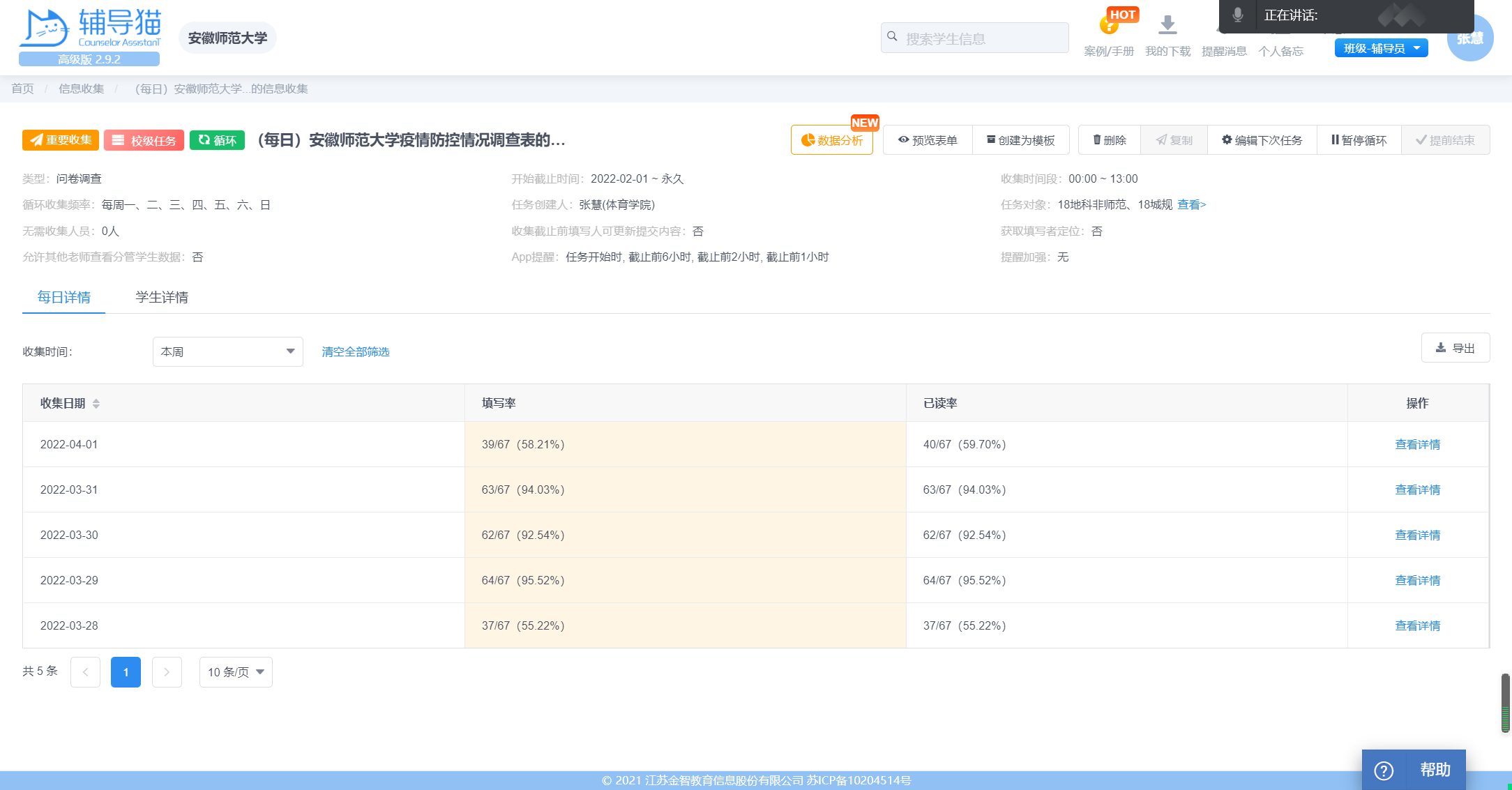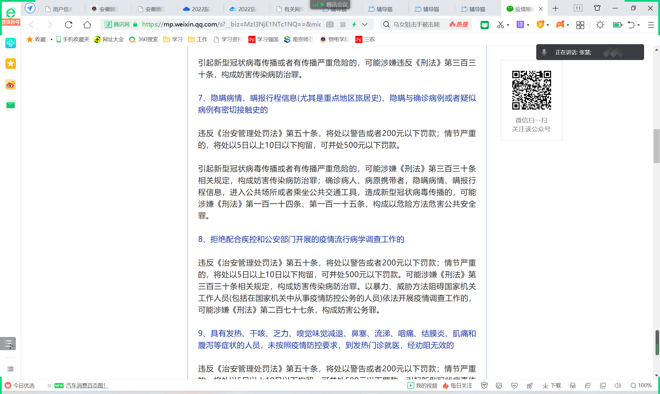 “疫情防控背景下要注意哪些方面的安全问题?”张慧就生理安全、心理安全、交通安全、食品安全、消防安全、财产安全、反诈骗、网络安全与学生进行交流,并做出了几点提示:注意天气变化,生病要及时报备就医,春季易过敏同学还需小心过敏原;注意校内交通,岔路口与拐弯处要减速慢行;合理饮食少点外卖,如需点外卖一定要选择正规门店;注意用电安全,做到人走断电,寝室与实验室不要出现明火;安装国家反诈中心app,主动学习反诈知识与视频,牢记“天上不会掉馅饼”、“给钱不要,要钱不给”,保障财产安全的同时注意个人信息安全;不信谣不传谣,网络发声要弘扬正能量。
