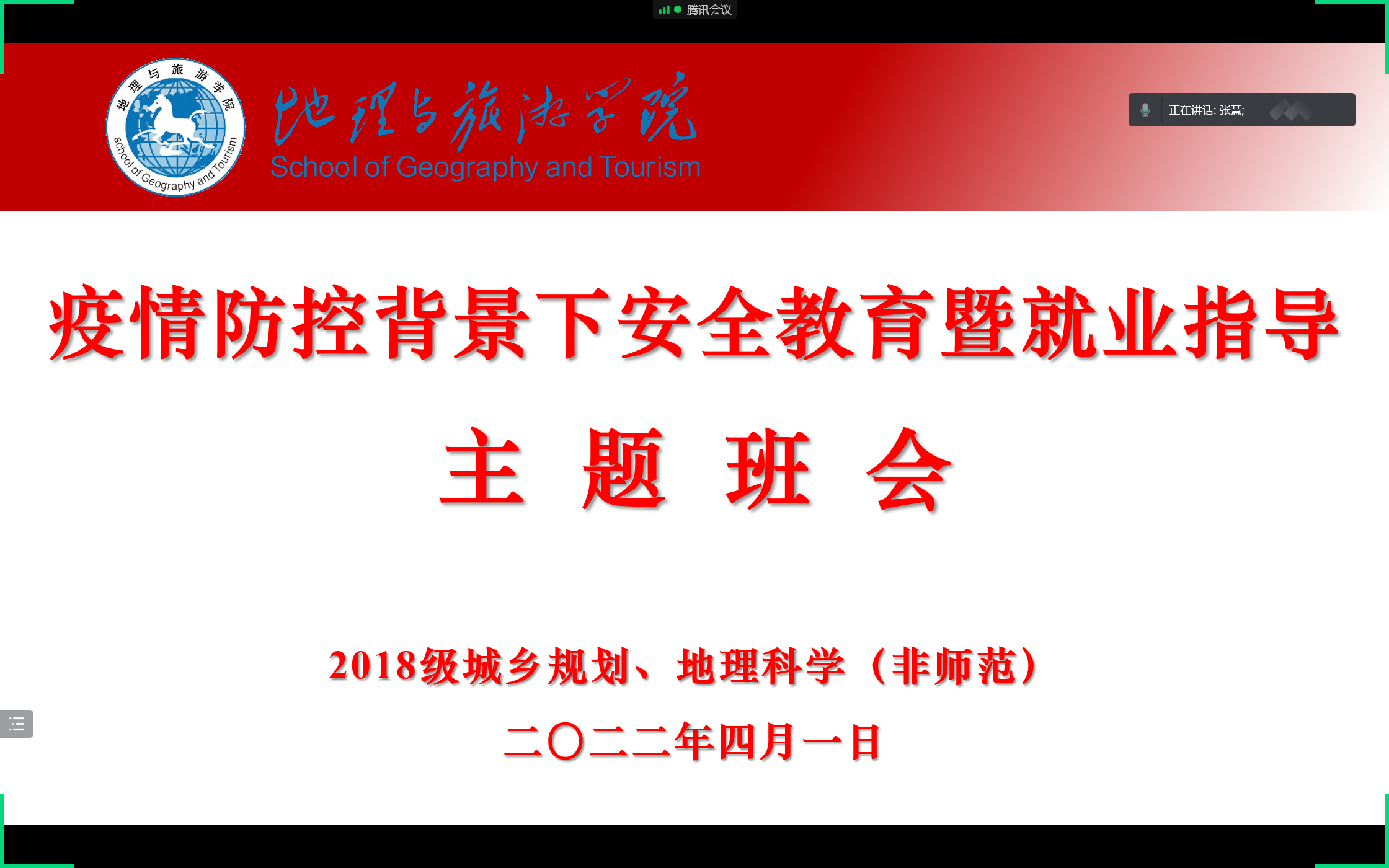 (本网讯 张慧)为扎实稳妥有序做好校园疫情防控,推进毕业生复试调剂及就业工作,2022年4月1日上午11点,2018级城乡规划、地理科学(非师范)专业在腾讯会议召开疫情防控背景下安全教育暨就业指导主题班会,会议由辅导员张慧主持,全体学生参会。