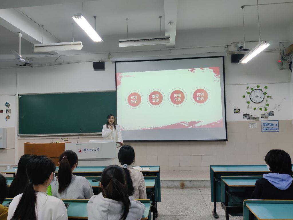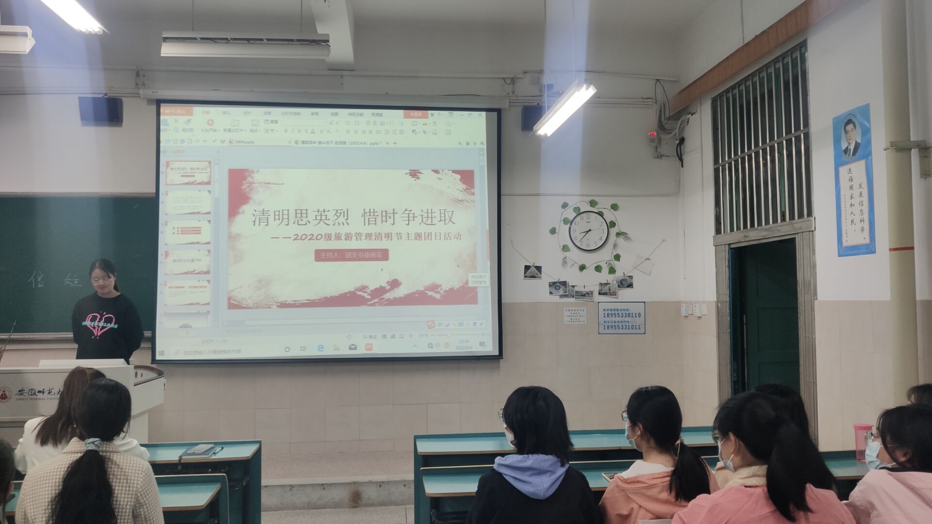 本网讯(地旅学院 赵佳慧 舒玉茹)为切实发挥中华民族传统节日的涵育功能,进一步引导青年团员传承民族精神,坚定理想信念,牢记英烈的丰功伟绩、传承英烈的伟大精神,用实际行动庆祝建团100周年。2020级旅游管理于4月4日晚开展“清明祭英烈 惜时争进取”主题团日活动。本次活动由团支书徐雨菲主持,校团委朱蕾老师、辅导员赵佳慧老师出席活动,2020级旅游管理全体本科生参加。