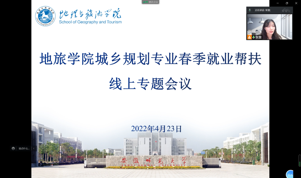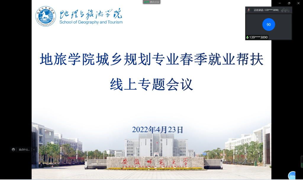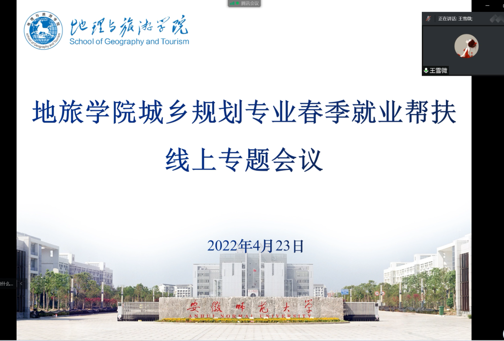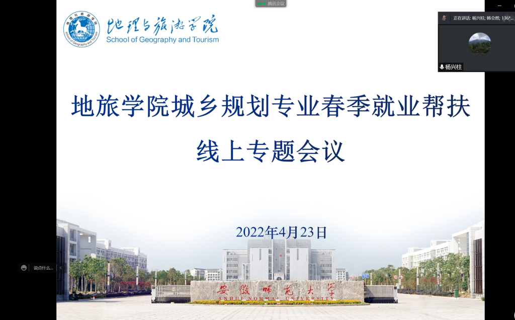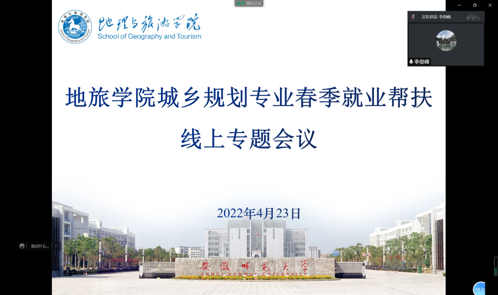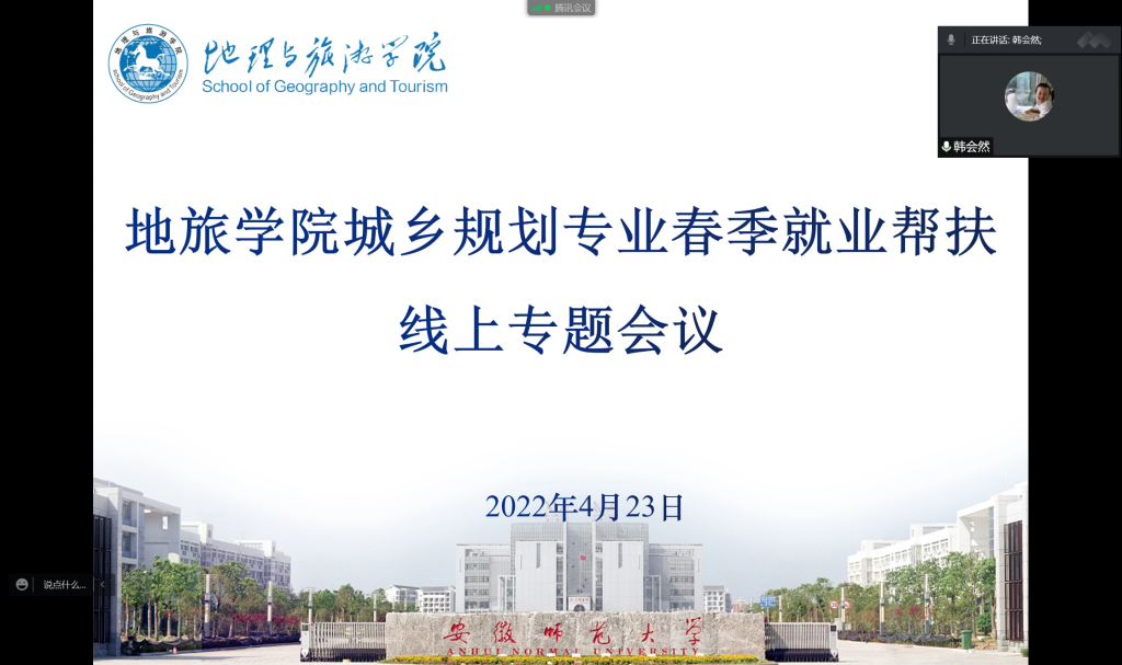 为全力推进2022届毕业生就业工作,4月23日晚19点,地旅学院召开城乡规划专业春季就业帮扶线上专题会议,学院党委书记贾冠忠、党委副书记乔静、副院长杨兴柱、城乡规划专业负责人韩会然、专业全体教师及辅导员张慧参加了此次会议。会议由韩会然主持。