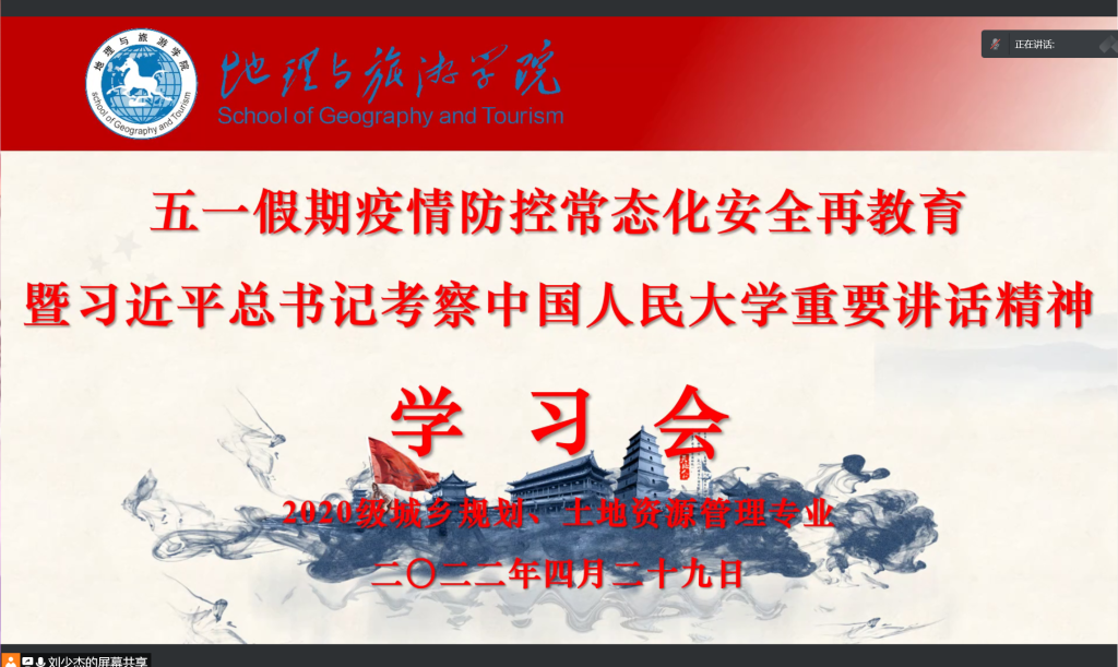 本网讯 (地旅学院 刘少杰 张楠) 为增强学生疫情防控意识,加强学生日常安全教育管理,4月29日晚,2020级城乡规划、土地资源管理专业召开五一假期疫情防控常态化安全再教育线上主题班会。此次会议由辅导员刘少杰主持,2020级城乡规划、土地资源管理专业全体成员参会。