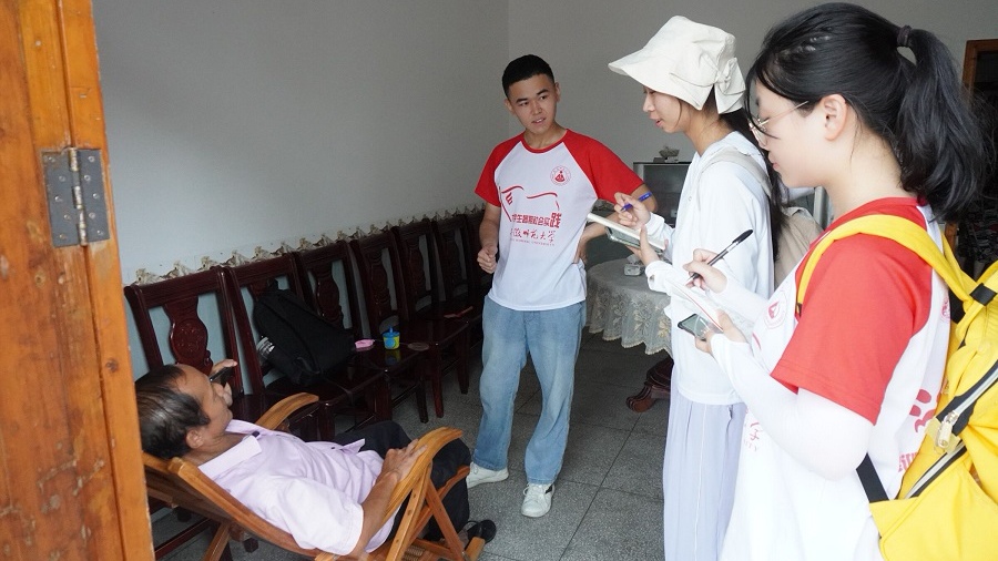 沿着田间小道,队员们兵分两路,一部分前往村民住处实地调研,另一部分前往村委会采访村干部当地乡村振兴战略的具体实施。前者来到村民家中,经过一番采访询问,村民表示这里的生活发生了翻天覆地的变化;后者在与村干部及相关专业人员交谈中也得知,桂花村经济来源主要来自农产品的种植,尤其是当地特色的紫红米,政府有出资帮助打造销售特色农产品的电商平台,面向全国,拉动当地产业发展,扩展产业链;在红色文化传承,文娱设施打造方面也取得了一定的成就。