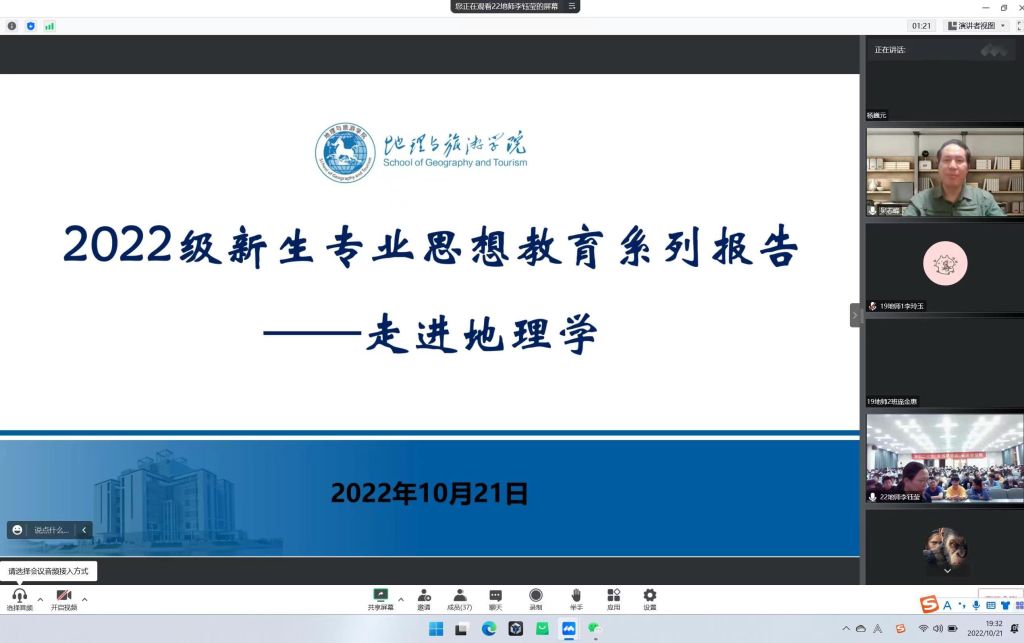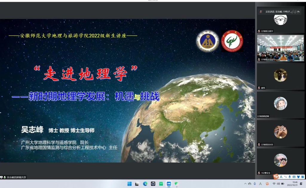 10月21日晚,beat365英国官方网站在实验楼101报告厅举行线上新生专业思想教育报告会。广州大学地理科学与遥感学院院长吴志峰应邀参加,通过云会议的形式为新生做了“走进地理学”的报告。地旅学院院长方凤满、专业教师代表、地理科学专业新生参加此次报告会,报告会由方凤满主持。