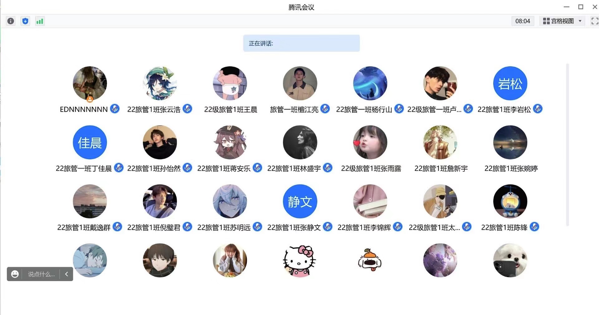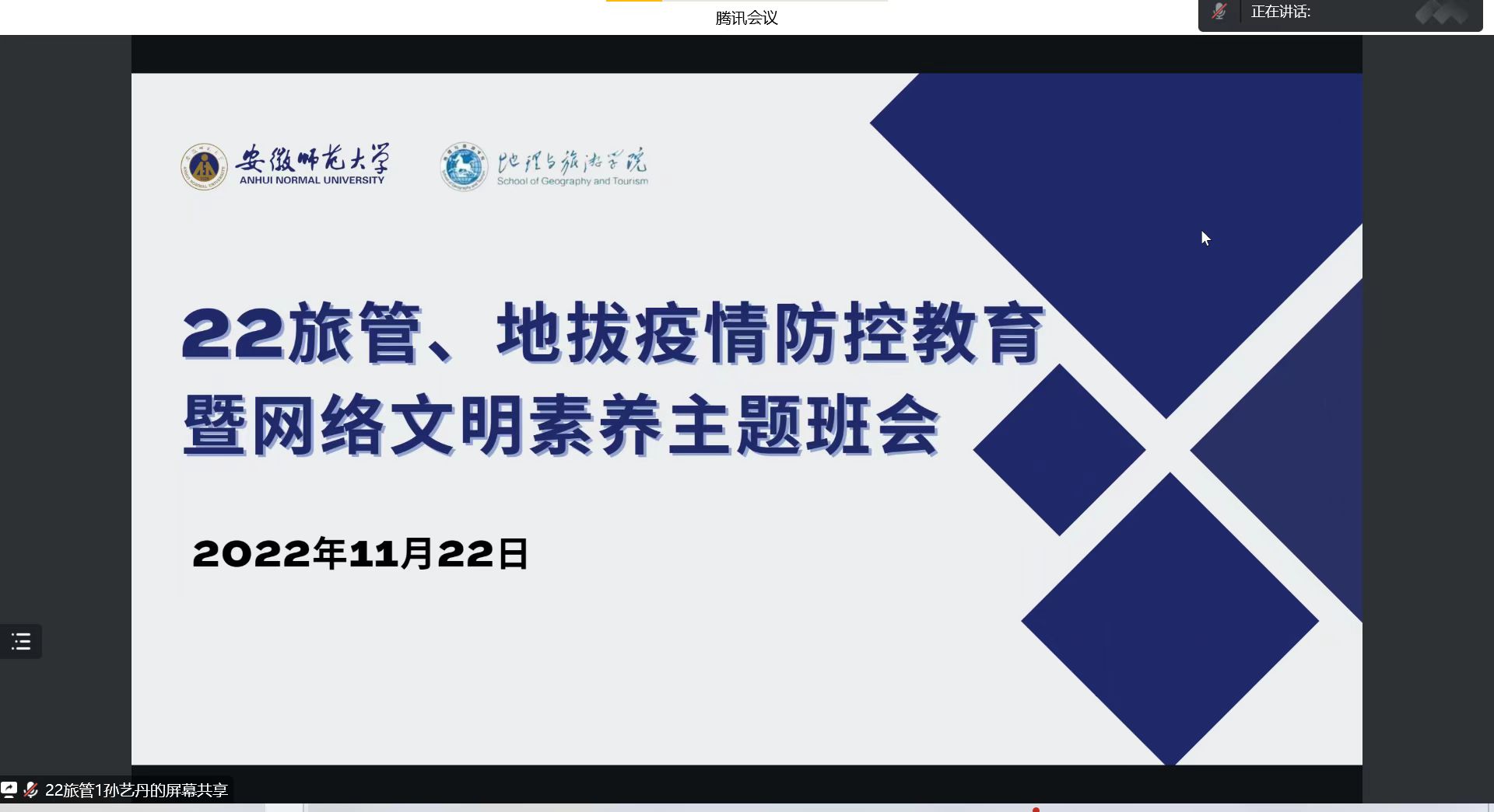 为了做好新冠肺炎疫情防控知识的普及,切实做好疫情防控工作,提升同学们网络文明素养,11月22日中午13:00,2022级旅游管理、地理科学(拔尖班)开展了疫情防控暨网络文明素养教育线上主题班会,会议由辅导员谢园主持,全体学生参会。