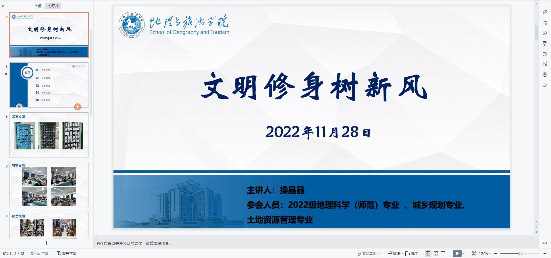 为提高学生文明意识及思想道德修养,加强大学生文明修身教育,2022年11月28日晚,2022级地理科学(师范)专业、土地资源管理专业、城乡规划专业开展“文明修身树新风”线上主题班会,全体学生参会,班会由辅导员操晶晶主持。