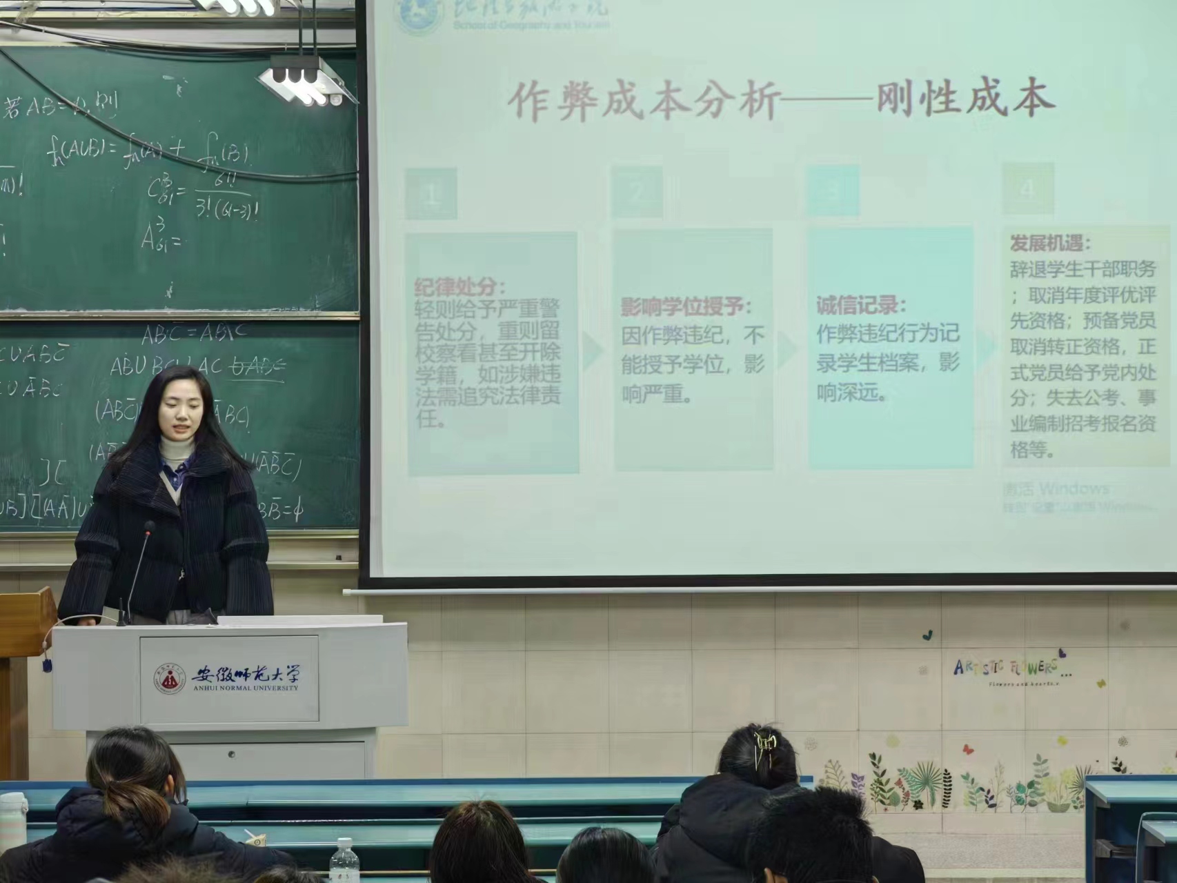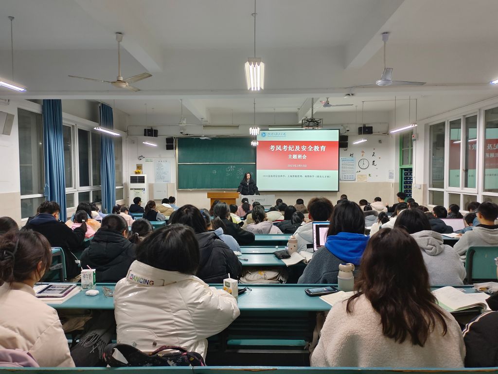 本网讯(地旅学院 魏语菲、陈祥云)2月13日晚,2022级地理信息科学、地理科学(拔尖人才班)、土地资源管理分别于教学楼4号楼201、202、302教室举行考风考纪教育主题班会,会议由辅导员陈祥云主持,全体180名同学参与此次会议。
