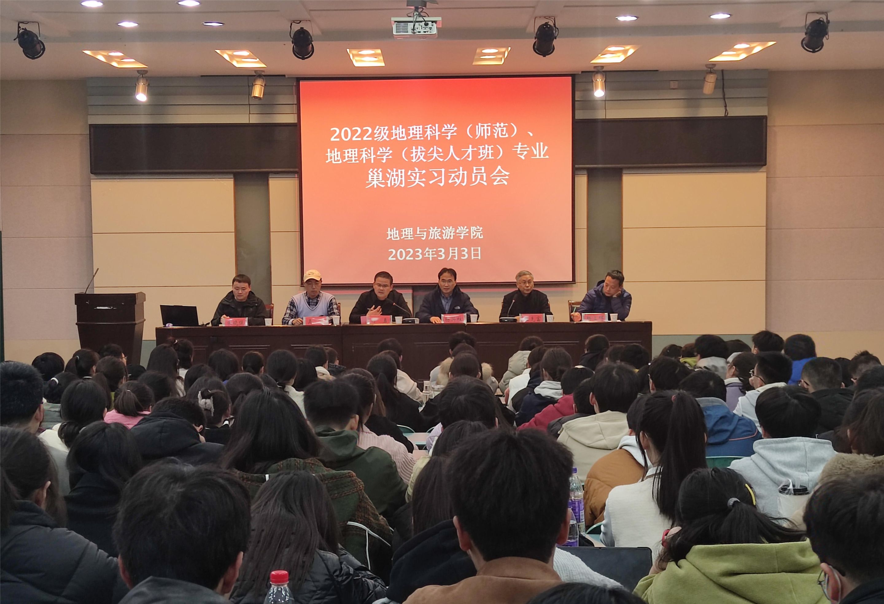 2023年3月3日晚,beat365英国官方网站召开2022级地理科学(师范)、地理科学(拔尖人才班)专业巢湖实习动员大会,学院党委副书记付勇,副院长杨兴柱,实习指导老师程先富、吴立、杨立辉、朱晓强以及辅导员陈祥云、操晶晶出席会议,2022级地理科学(师范)、地理科学(拔尖人才班)专业全体学生参加会议,会议由程先富教授主持。