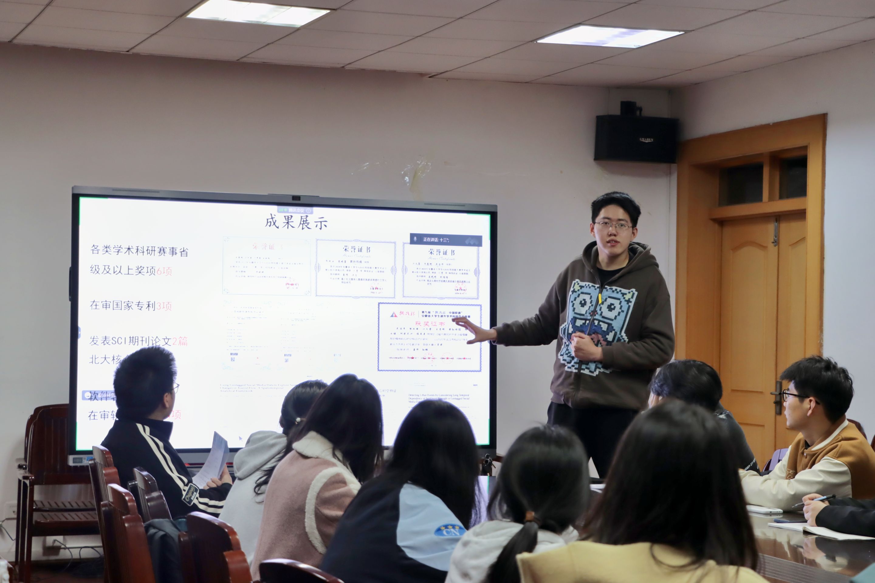 “小先生”吴浩泽同学在校期间自主创业,目前为星瞻科技有限公司负责人,曾荣获第八届中国国际“互联网+”大学生创新创业大赛省级银奖、第九届“挑战杯”安徽省大学生课外学术科技作品竞赛二等奖。他以“讲好调研故事,说实科研成果”为主题进行经验分享,他指出确定竞赛主题后应充分开展调研,充实“数据库”,为后续研究奠定数据基础;其次,应善于发挥学科优势,借助校院交流平台,整合资源,为团队吸纳多学科、多层次人才;同时,应注重成果转化,将项目“落地生根”,打通“创新最后一公里”。