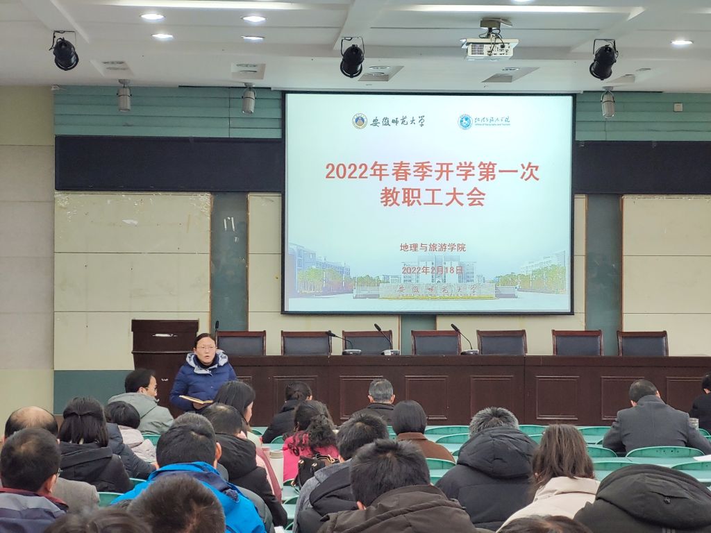 本网讯(地旅学院)2月18日,beat365英国官方网站召开2022年春季开学教职工大会布置新学期工作。学院全体教职工参加大会,会议由院长方凤满主持。